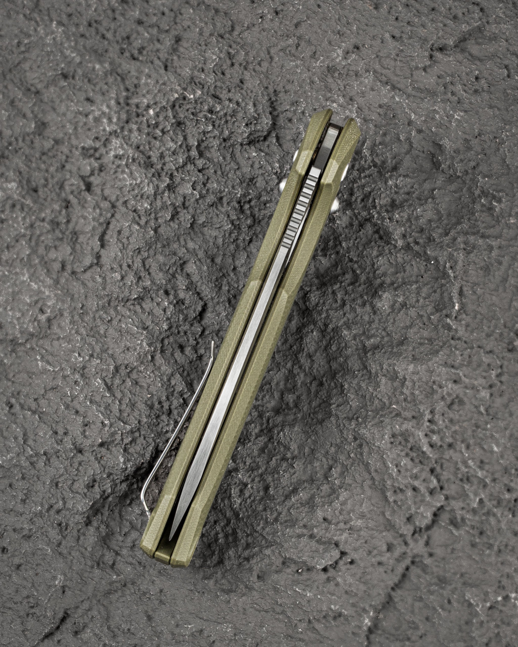 A markolat panelei nagy teherbírású OD Green G10 anyagból készültek, amely egy üvegszállal erősített és műgyantával impregnált laminátum (olyan ipari kompozit, amely teljesen érzéketlen a nedvességre, a hőtágulásra és a mechanikai ütésekre, így nem vetemedik meg). A 131 mm zárt hosszúságú markolat méretezése a nagyobb kezű felhasználóknak is tökéletes kontrollt biztosít, az ergonomikus ívek pedig segítik a csúszásmentes fogást még kesztyűben vagy nedves környezetben is. A 142 grammos összsúly jelzi, hogy a belső szerkezetet masszív rozsdamentes acél linerek merevítik (a markolatpanelek közé épített vázlemezek), amelyek megakadályozzák a markolat csavarodását terhelés alatt. A 225 mm teljes hosszúságú konstrukció a stabil erőátvitelre lett optimalizálva, a texturált felület pedig garantálja, hogy az eszköz ne mozduljon el a tenyérben, biztosítva a folyamatos biztonságot és a kéz fáradásának minimalizálását a hosszan tartó igénybevétel során, megőrizve a szerszám formatartását extrém környezeti hatások mellett is.