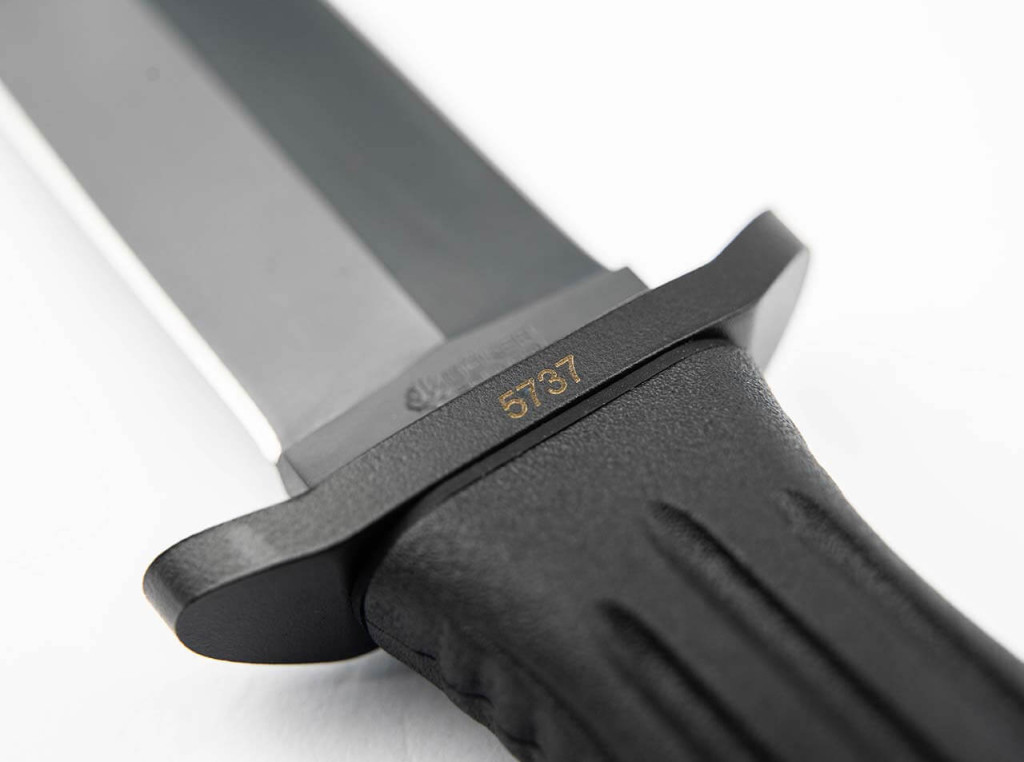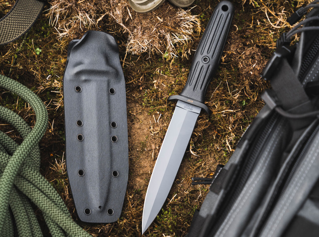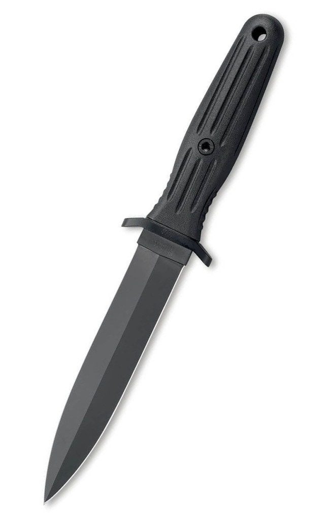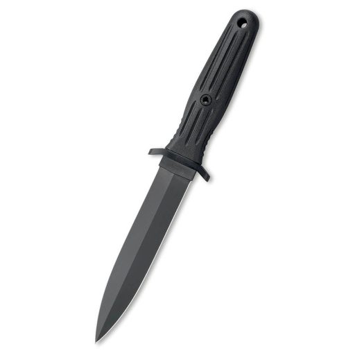 Ez a modell fixpengés taktikai kés, amelynek pengéje 440C rozsdamentes acélból készült, fekete titán‑alumínium‑nitrid bevonattal, ami csökkenti a fényvisszaverődést és növeli a korrózió‑ellenállást, valamint kopásállóságot is biztosít. A pengetípus kétélű tőr (dagger) kialakítású, amely ideális mind penetrációra, mind gyors, kiegyensúlyozott szúró‑ és vágási manőverekhez egyaránt. A markolat üvegszállal erősített Delrin műanyagból készült, beépített rozsdamentes acél súlyokkal, így biztosítva stabil, ergonomikus fogást még intenzív használat közben is. A keresztvédelem sárgarézből készült, amely vizuálisan is erőteljes, ugyanakkor növeli a kés használati biztonságát és kezelhetőségét. A késhez egy tartós Kydex hüvely tartozik, amely nagy Tek‑Lok rögzítővel ellátott, így többféle viseleti és hordozási opciót tesz lehetővé, legyen szó övre szerelésről vagy felszereléshez csatolásról.