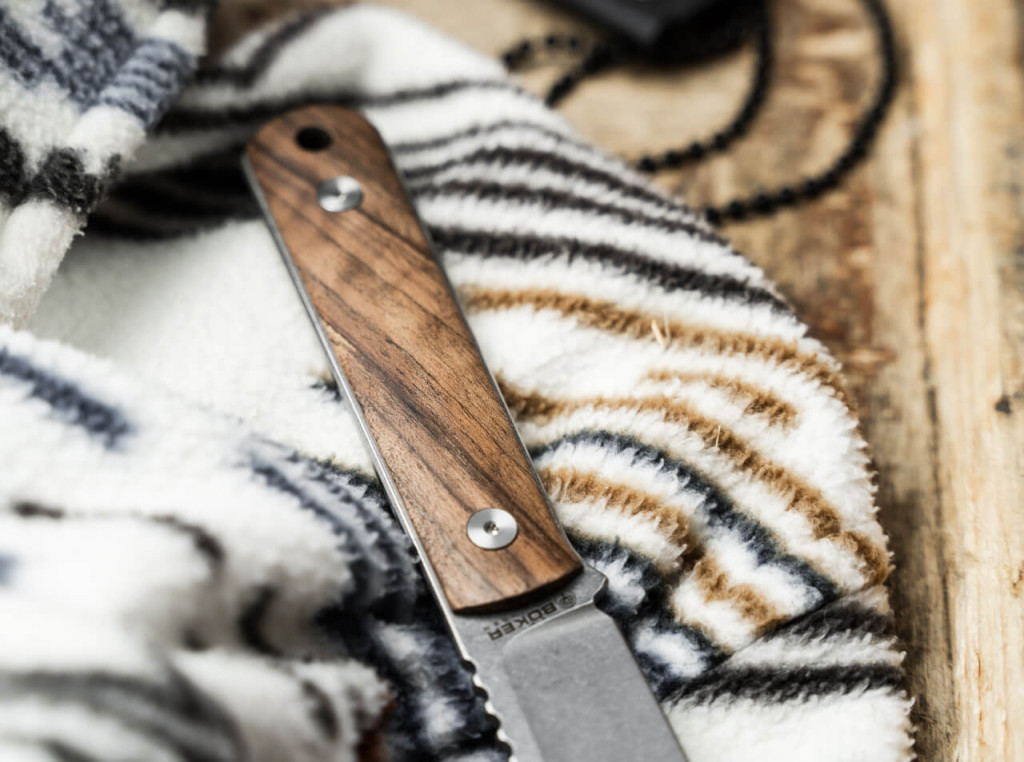 A markolat kialakításánál a súlycsökkentés és a klasszikus elegancia volt az irányadó szempont. A full tang felépítésű kés vázát a markolat alatt kikönnyítették (skeletonized), hogy megfeleljen a Packlite elnevezésnek. Erre az acélvázra kerültek fel a finomra csiszolt diófa (Walnut) markolatpanelek, amelyek természetes melegséget és biztos fogást kölcsönöznek az eszköznek. A diófa nemcsak tartós, hanem az idő múlásával gyönyörű patinát is kap, hangsúlyozva a kés prémium jellegét. Annak ellenére, hogy a kés összsúlya mindössze 31-37 gramm, az ergonomikus ívek és a markolat végén található nagyméretű zsinórfurat kényelmes és biztonságos használatot tesz lehetővé minden kézméret számára. A hordozhatóságot egy precízen illeszkedő Kydex tok teszi teljessé, amelyhez egy golyóslánc is tartozik, így a kés nyakkésként is hordható, de könnyen rögzíthető övön vagy hátizsákon is. Ez a kompakt kialakítás biztosítja, hogy a BFF Packlite észrevétlenül simuljon a ruházathoz, mindig készen állva a bevetésre.
