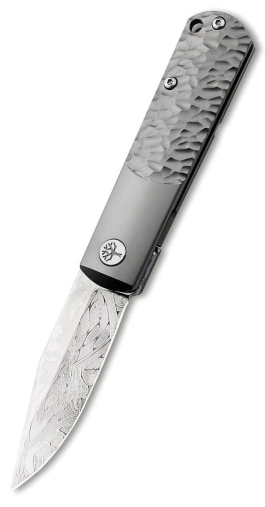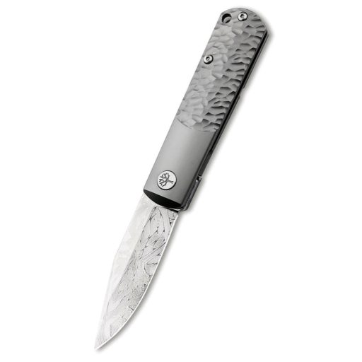 A markolat kialakítása a klasszikus Barlow tradíciók és a kozmikus inspiráció tökéletes szimbiózisa. A precíziósan mart titán markolat textúrája a meteoritok jellegzetes, szabálytalan felületét idézi, amely egyszerre nyújt futurisztikus megjelenést és rendkívül stabil, kényelmes fogást. Az elülső rész a Barlow modellekre jellemző hosszú baknit formázza, amely zökkenőmentesen megy át az organikusabb hátsó textúrába. A pengét egy diszkréten integrált Framelock zárszerkezet rögzíti, amely edzett acél betéttel (lockbar insert) van ellátva a minimális kopás és a maximális biztonság érdekében. A nyitásról egy apró, diszkrét flipper gondoskodik, amely nyitott állapotban teljesen eltűnik, megőrizve a kés letisztult, elegáns sziluettjét. A mart titán zsebklip és a markolat végén található zsinórfurat a praktikus hordozhatóságot szolgálja, miközben a tengelycsavart díszítő Boker embléma finom esztétikai hangsúlyt ad az eszköznek.