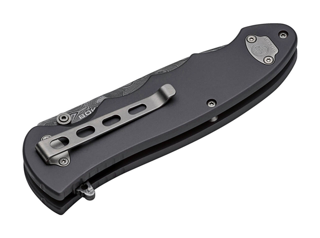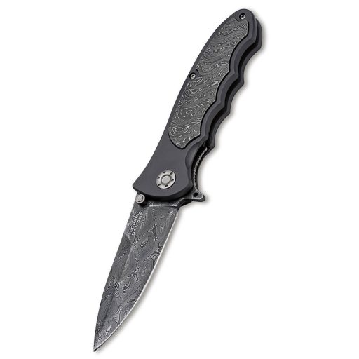 A markolat szerkezete egy igazi technikai csemege: az alapváz AlMgSi1 alumíniumötvözetből készül, amely kemény eloxálása révén rendkívül ellenálló a kopással szemben. Azonban a modell igazi különlegessége – amit a legtöbb leírás elvét –, hogy a markolatbetétek sem fából, hanem 180 rétegű Leopard-damaszkusz acélból készültek. Ez a „double damask” megoldás (damaszkusz penge és damaszkusz betét) ritka és látványos egységet teremt, ahol a harckocsi-acél vizuálisan és fizikailag is uralja az egész eszközt. A markolat ergonómiai ívei és a rozsdamentes acélból készült liner lock zárrendszer garantálják a biztonságos és stabil használatot minden helyzetben.