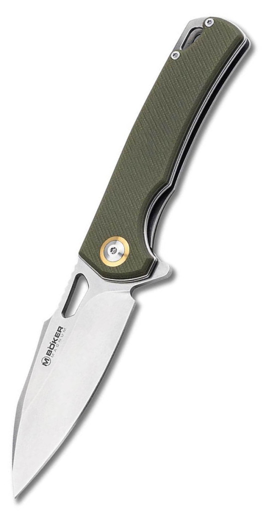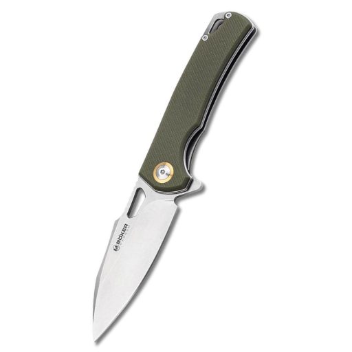 A Böker Magnum Skeksis markolata zöld színű G10 anyagból készült, amely egy speciális üvegszál-erősítésű epoxigyanta laminátum. Ez az anyag kiemelkedő mechanikai szilárdsággal (az anyag ellenállása a fizikai hatásokkal, töréssel és kopással szemben) rendelkezik, és nem reagál a nedvességre vagy a vegyi anyagokra, így a markolat mérete és stabilitása évtizedekig változatlan marad. A markolatpanelek felülete texturált, ami garantálja a csúszásmentes fogást és a biztonságos munkavégzést nedves vagy poros körülmények között is. A biztonságért a megbízható linerlock (keresztzár, ahol a markolat belső rugós fémlemeze nyitott állapotban a penge tövéhez ugrik, rögzítve azt) felel, amely megakadályozza a penge váratlan becsukódását használat közben. Az ergonomikus kialakítás (az emberi kéz természetes formájához és fogásához igazított tervezési elv) révén a markolat ívei elosztják a nyomást a tenyér felületén, biztosítva a kontrollált erőkifejtést és a kényelmes használatot hosszabb ideig tartó munkavégzés során is.