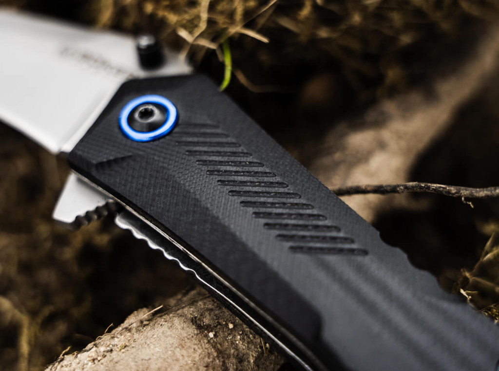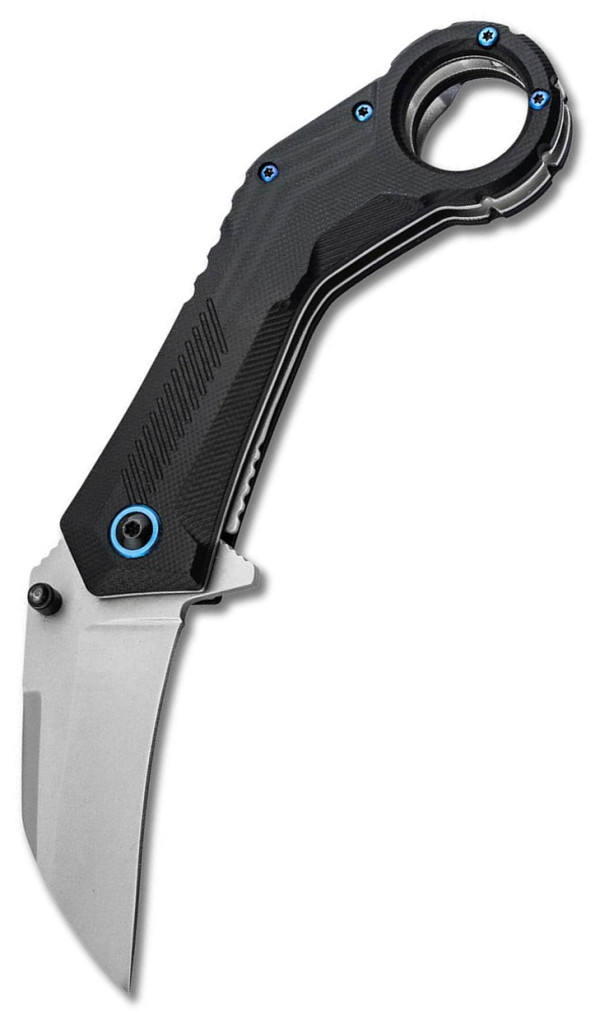 A markolat kialakítása során a maximális kontroll és a kényelem volt az elsődleges szempont. Az ívelt vázra épített texturált G10 (nagy nyomáson préselt, üvegszál-erősítésű műgyanta laminátum) markolatpanelek még nedves vagy csúszós körülmények között is biztos fogást garantálnak. A karambitokra jellemző módon a markolat végén egy ujjgyűrű található, amely eredetileg a kés kisujjal való rögzítésére szolgált, de a modern használatban zsinórfuratként (lanyard hole) is tökéletesen funkcionál. Az esztétikai megjelenést a kék eloxált (elektrokémiai úton színezett és védőréteggel bevont) elemek teszik teljessé: a penge tengelycsavarja körüli gyűrű és a markolatot tartó csavarok vibráló kontrasztot alkotnak a sötét panelekkel. Ez a modern akcentus egyedivé teszi a délkelet-ázsiai eredetű formavilágot, miközben az ergonomikus hajlítás biztosítja, hogy a kés természetesen feküdjön a kézben.