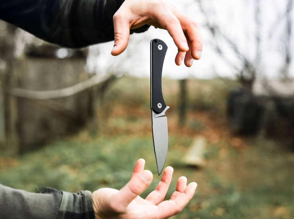 A tervezés során az ergonómia és a biztonság volt a legfőbb szempont, amit a markolat karcsú dereka és ívelt vonalvezetése is hűen tükröz. A markolatpanelek prémium fekete G10 (nagy nyomáson préselt üvegszál-erősítésű műgyanta laminátum) anyagból készültek, amely híres arról, hogy sem a nedvességre, sem a szélsőséges hőmérsékletre nem érzékeny. A panelek hosszanti irányban texturáltak (érdesített, vonalas mintázattal ellátott felület), ami rendkívüli csúszásmentes fogást biztosít még vizes kézzel végzett munka során is. A markolat elején található ujjvédő (finger guard, a markolat és a penge találkozásánál lévő kiálló rész) megakadályozza, hogy a kéz a pengére csússzon, ezzel maximalizálva a biztonságot. A kés súlya mindössze 54 gramm, ami a 17,20 centiméteres teljes hosszal párosítva egyedülálló pehelysúlyú társsá teszi, így a hordozása szinte észrevétlen marad. A markolat végén található zsinórfurat (lanyard hole, rögzítőzsinór számára kialakított lyuk) további hordozási és rögzítési lehetőségeket kínál a felhasználó számára, biztosítva a könnyű hozzáférhetőséget.