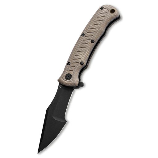 A kezelhetőséget és a biztonságot a modern technikai megoldások emelik magas szintre, biztosítva a felhasználó számára a maximális kontrollt. A penge villámgyors nyitásáról a markolatból kiálló flipper (nyitókar, amelyre nyomást gyakorolva a penge kipattan) gondoskodik, amely a beépített golyóscsapágyas rendszernek köszönhetően selymesen sima mozgást biztosít. Nyitott állapotban a megbízható linerlock (keresztzár, amely egy belső acéllemezzel rögzíti a pengét) tartja fixen a szerkezetet, megakadályozva a véletlen becsukódást intenzív munka közben. A markolat anyaga barna Micarta (műgyantával nagy nyomáson préselt textil), amely nemcsak esztétikus, hanem rendkívül időjárásálló és csúszásmentes fogást biztosít még nedves vagy sáros kézzel is. Az ergonomikus kialakítás és a markolat végén található sárgaréz zsinórfurat (brass lanyard stud) a klasszikus, fix pengés tracker modellek hangulatát idézi, miközben praktikus rögzítési lehetőséget kínál. A 19 centiméteres teljes hossz kényelmes fogást biztosít bármilyen kézmérethez, miközben a 107 grammos súly és a szerkezet tökéletes egyensúlyt teremt a penge és a markolat között.