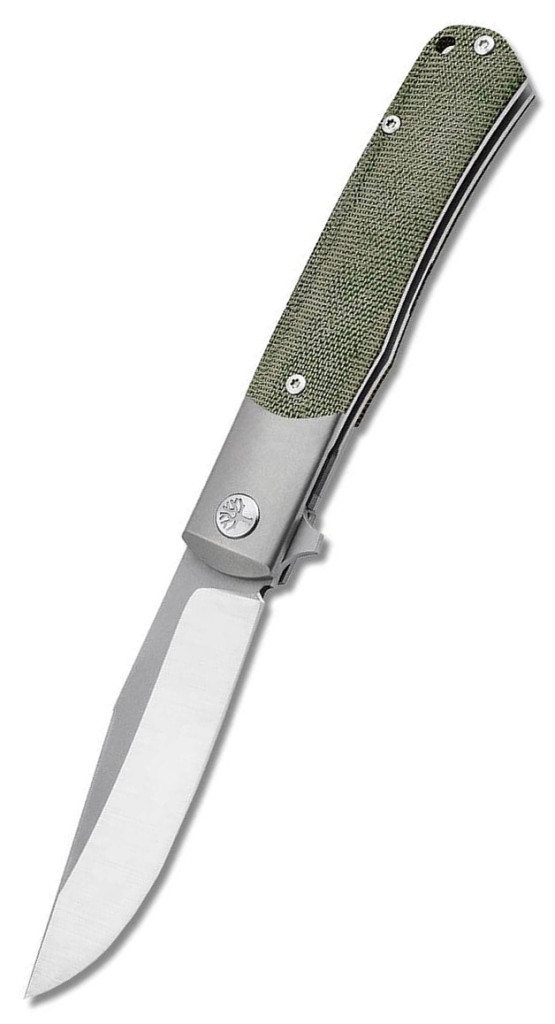 A markolat kialakítása a minimalista luxust tükrözi. Az alapvázat és a biztonságos Frame Lock zárszerkezetet tömör titánból marták ki, ami egyszerre biztosít hihetetlen stabilitást és rendkívül alacsony, mindössze 70 grammos súlyt. A titán vázba illesztett zöld Micarta betétek meleg, texturált fogást adnak, amely az idővel és a használattal egyedi patinát kap. A Frame Lock zár egy acél betéttel is el van látva, ami megakadályozza a titán és az acél penge közötti kopást, így garantálva a zár évtizedekig tartó, pontos működését.