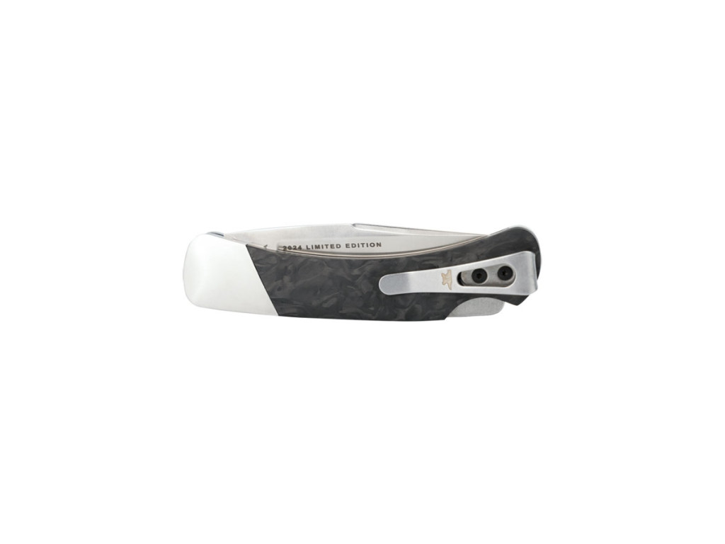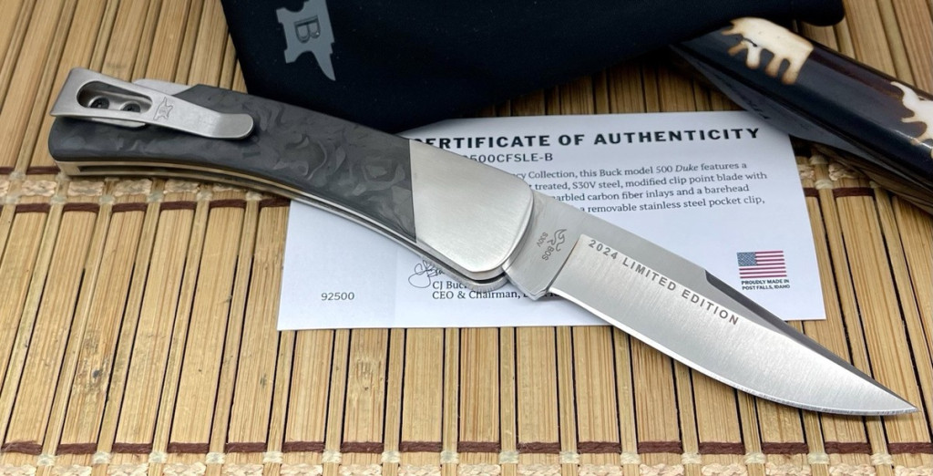 A penge anyaga CPM S30V, amelyet a gyártó a Limitált Széria egyik fő jellemzőjeként jelöl meg: nagy él-tartás, korrózióállóság és megbízhatóság jellemzi. A penge clip-point kialakítású, sima élkiképzéssel, ami jól használható mindennapi feladatokra, előkészítő vágásokra, csomagbontásra vagy precíz irányítást igénylő feladatokra. A markolat különleges szénszál (carbon fiber) betétekkel készül, melyek a fém betétekkel és a polírozott elemekkel együtt nemcsak látványosak, hanem könnyű és merev szerkezetet biztosítanak. A zármechanizmus backlock, amely a klasszikus Buck-tradíciót követi, stabil rögzítést ad, és a penge véletlen záródását megbízhatóan akadályozza meg. A modell korlátozott darabszámban készült, egyedi sorszámozással, így esztétikai értéke legalább annyira jelentős, mint használati oldalról.