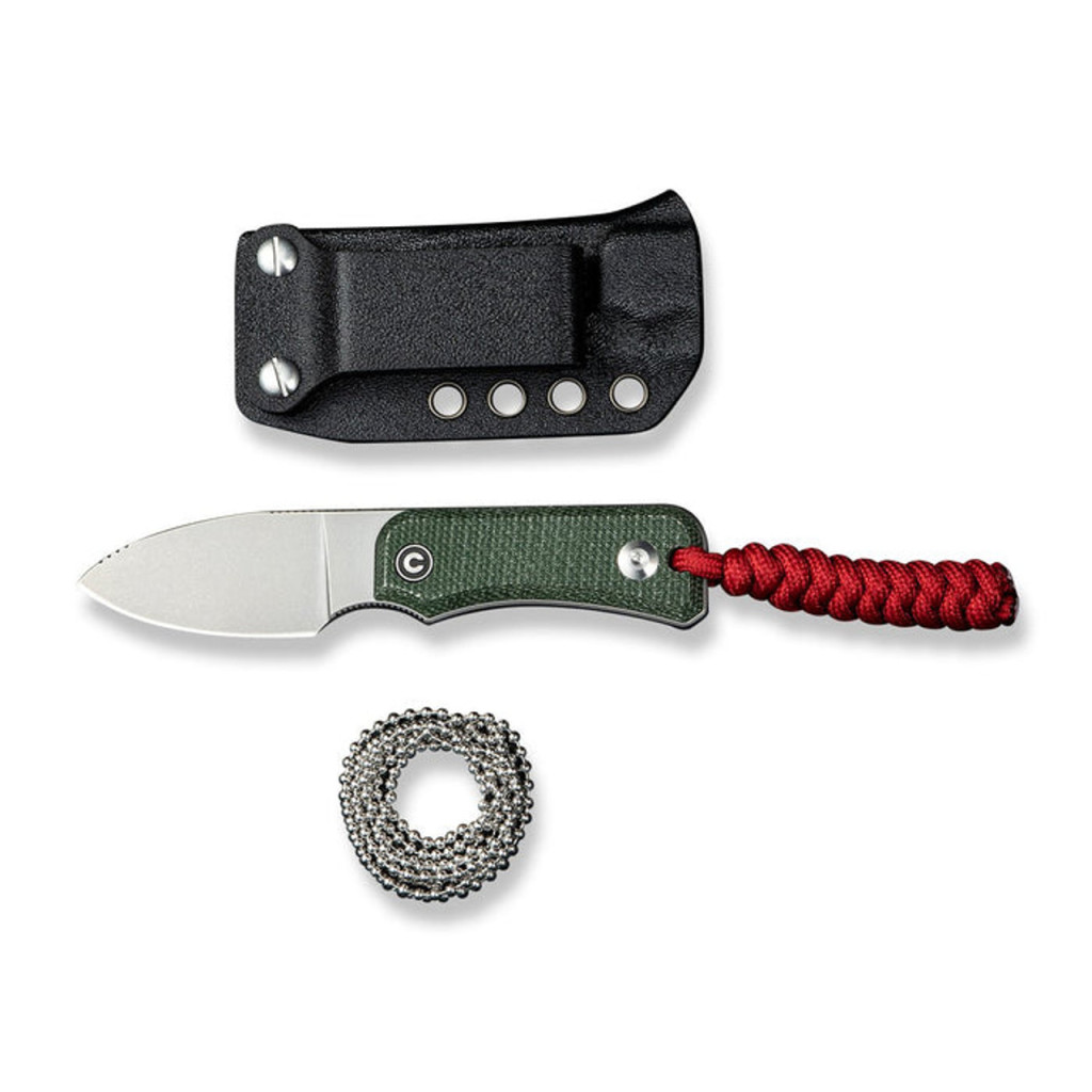 A kés tömege 53,6 g (lanyarddal együtt), teljes hossza 126,9 mm, a penge hossza 60,6 mm, vastagsága 3 mm. A Nitro-V acél hőkezelve 59–61 HRC keménységre, így hosszú élettartamú és strapabíró. A drop point pengeforma erős hegyet és irányított vágást biztosít, a stonewashed felület csökkenti a karcolódásokat és védi a pengét. A markolat zöld vászon micarta, amely ellenáll a nedvességnek és a hőmérséklet-ingadozásnak, idővel patinát kap. A fekete Kydex tok biztonságos hordozást tesz lehetővé, IWB elhelyezésben diszkrét, a paracord zsinór gyors elővételt biztosít. A tervező Ben Petersen, a gyártás helye Kína, a márka a prémium minőséget képviseli.