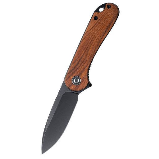 A markolat különlegességét a természetes Cuibourtia fa adja, amelynek erezete minden darabot egyedivé tesz. A fa meleg tónusa kontrasztot képez a fekete elemekkel, így a kés egyszerre hat elegánsnak és határozottnak. A flipperes nyitás a kerámia golyóscsapágyas tengelyrendszer révén gyors és selymes mozgást biztosít, míg a liner lock zármechanizmus biztonságosan tartja a pengét használat közben.