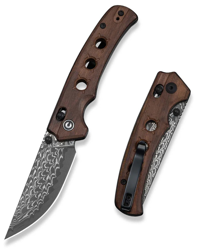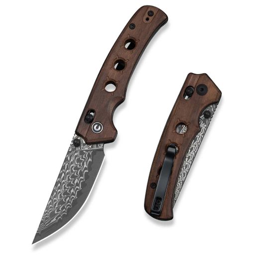 A markolat alapját a gyönyörű, mély erezetű Guibourtia fa adja, amely egy Afrikából származó, rendkívül kemény és tartós trópusi keményfa (gyakran használják luxuscikkekhez és hangszerkészítéshez a nagy sűrűsége és esztétikai értéke miatt). Ez a természetes anyag nemcsak meleg és kényelmes fogást biztosít a hidegebb napokon is, hanem minden egyes darabnak egyedi, megismételhetetlen mintázatot kölcsönöz, miközben jelentősen hozzájárul az eszköz rendkívül alacsony súlyához. A 105 mm zárt hosszúságú markolat mindössze 12 mm vastag, ami garantálja a diszkrét viselhetőséget és az ergonómikus kialakítást (az emberi kéz természetes formájához igazított formai megoldások), segítve a biztonságos és stabil erőátvitelt munka közben. A fa természetes tapadása és a markolat íves kiképzése csúszásmentes kontrollt biztosít, megakadályozva a kéz elfáradását a hosszabb ideig tartó használat során. Az egész szerszám mindössze 73 g súlyú, ami a fa sűrűsége és a vázasított belső szerkezet együttes eredménye, így a kés gyakorlatilag észrevétlen marad a zsebben. A természetes alapanyag és a fém alkatrészek találkozása egy olyan szerkezeti stabilitást eredményez, amely ellenáll a mindennapi használat során fellépő mechanikai igénybevételnek, miközben az idővel kialakuló patina csak tovább nemesíti az eszköz esztétikai megjelenését. A markolat paneljei precízen illeszkednek a rozsdamentes acél vázhoz, így elkerülhetők a zavaró rések vagy élek, biztosítva a tökéletes komfortérzetet a használat során.