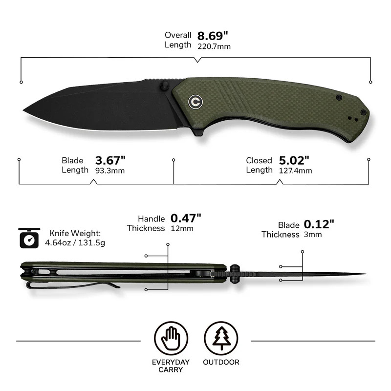 A vágóeszköz pengéje Sandvik 14C28N (svéd gyártmányú, nitrogénnel dúsított rozsdamentes acél, amely kiemelkedő éltartásáról és szívósságáról ismert) anyagból készült, amely 58-60 HRC (a Rockwell-skálán mért keménységi érték, amely meghatározza az acél ellenállóképességét) értékre van edzve. A 93 milliméteres pengehossz és a 3,0 milliméteres vastagság elegendő erőt biztosít a komolyabb vágási feladatokhoz is, miközben a Clip Point (a pengeháton található egyenes szakasz utáni lejtős ív, amely hegyesebb profilt és jobb szúróképességet ad) kialakítás növeli a precizitást. A Flat grind (lapos leélezés, ahol a penge a háttól az élig egyenletesen vékonyodik, minimalizálva az anyagellenállást) profil kiváló szeletelő képességet biztosít. A Black Stonewashed (fekete kőmosott finiselés, amely egy koptatási folyamat során jön létre, és matt, karcálló felületet ad) bevonat nemcsak a fényvisszaverődést gátolja, hanem hatékonyan elfedi a használat során keletkező apró sérüléseket is, növelve az acél tartósságát.