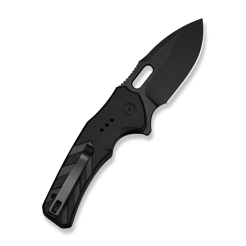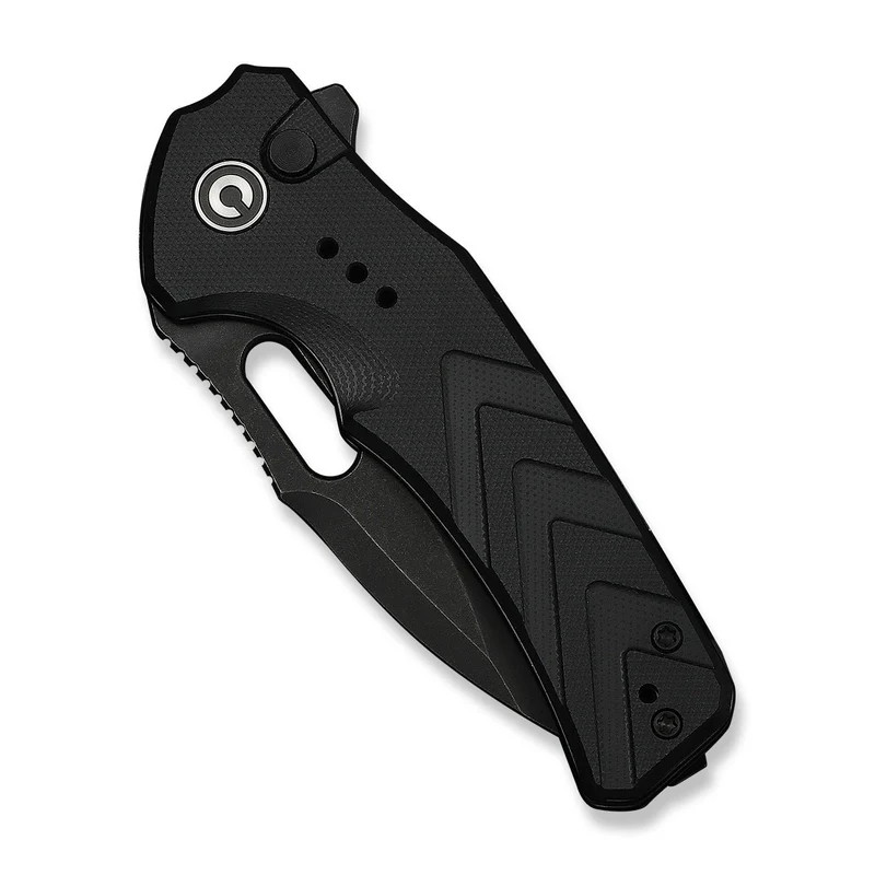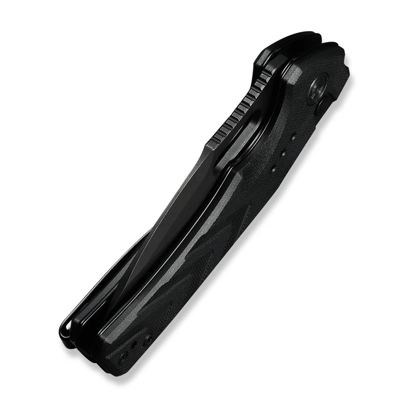 A markolat anyaga nagy teherbírású Fekete G10, amely egy üvegszállal erősített és műgyantával impregnált kompozit (olyan ipari laminátum, amely teljesen érzéketlen a nedvességre és a hőingadozásra, így extrém környezetben sem vetemedik meg és nem repedezik). A markolat felülete speciális Milled Chevron mintázatot kapott (V-alakú precíziós marás), amely nemcsak esztétikailag egyedi, hanem csúszásmentes fogást és magas fokú tapadást biztosít nedves környezetben vagy kesztyűben történő használat esetén is. A 107,8 mm zárt hosszúságú markolat ergonomikus kialakítása segíti a biztonságos erőátvitelt, miközben a szerkezetet robusztus rozsdamentes acél linerek merevítik. A 107 grammos összsúly ideális egyensúlyt teremt a hordozhatóság és a fizikai munkabírás között, biztosítva a kéz fáradásának minimalizálását a hosszan tartó igénybevétel során, megőrizve a szerszám szerkezeti szilárdságát.