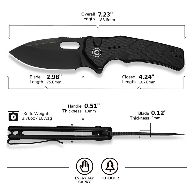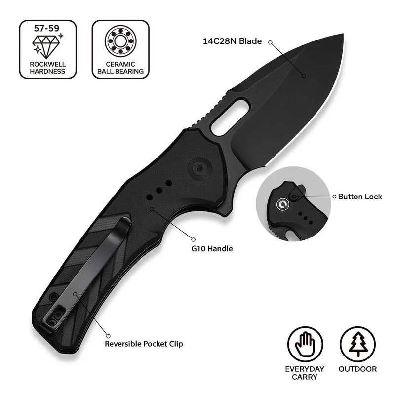 A technikai felszereltség alapja a Civivi házi tervezésű Button Lock zárszerkezete (egy nyomógombbal működtethető mechanizmus, amely nyitott állapotban sziklaszilárdan rögzíti a pengét, elkerülve a véletlen becsukódást). Ez a rendszer maximális biztonságot nyújt, és lehetővé teszi a villámgyors kezelhetőséget egyetlen kézzel is, mivel a gomb megnyomásával a penge ellenállás nélkül csukható. A penge nyitása kétféleképpen, a Flipper (nyitófül) vagy a Thumb Hole (nyitólyuk) segítségével történik, amelyek selymes futását a Caged Ceramic Ball Bearing (zárt kerámia golyóscsapágyas rendszer) garantálja a forgástengely körül. Ez a modern csapágyazás biztosítja az ellenállásmentes pengeindítást és a hosszú élettartamot, mivel a kerámia golyók nem korrodálódnak. A bicska 184 mm teljes hosszúságú, hordozhatóságát pedig egy rozsdamentes acélból készült Deep Carry zsebklipsz segíti, amely átszerelhető a jobb és bal oldali hordozáshoz egyaránt.