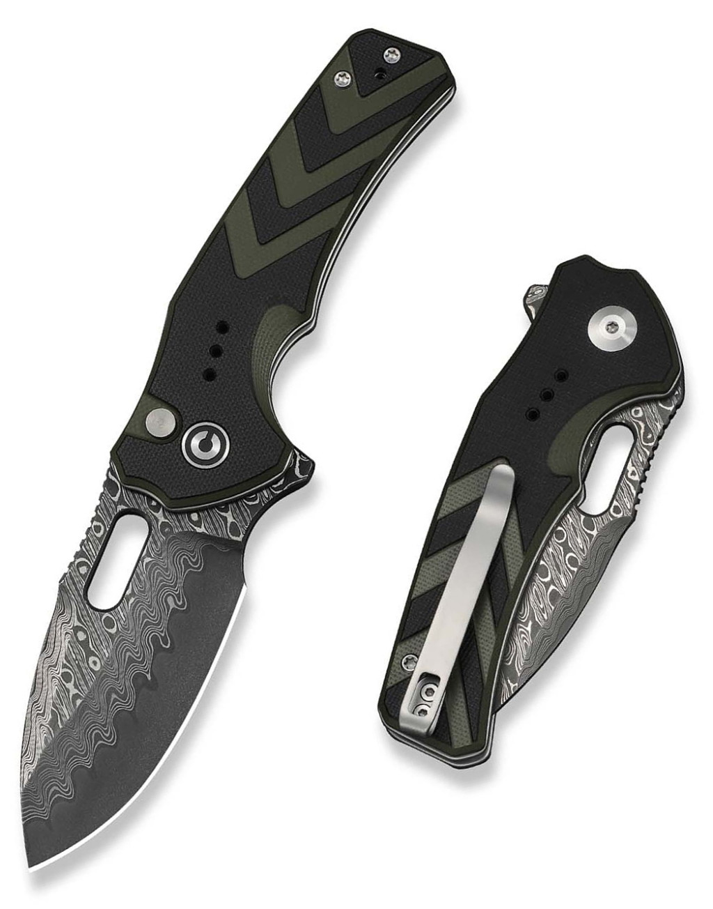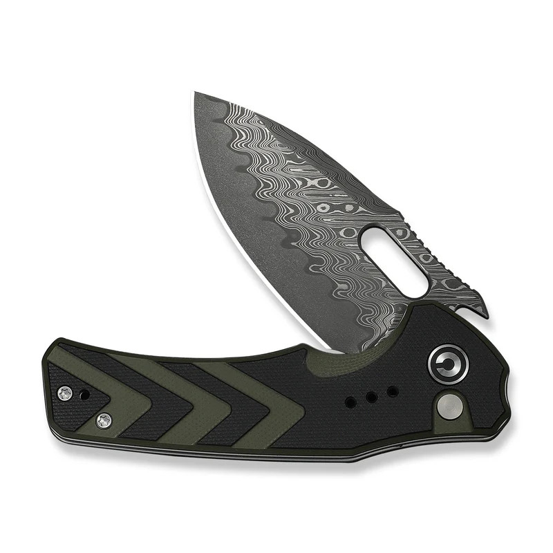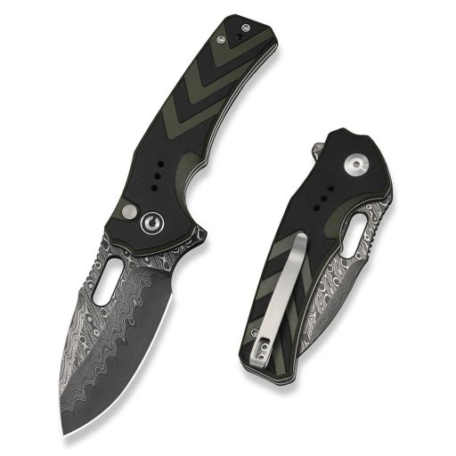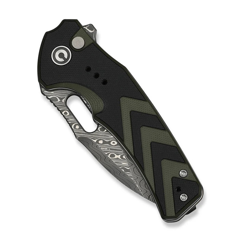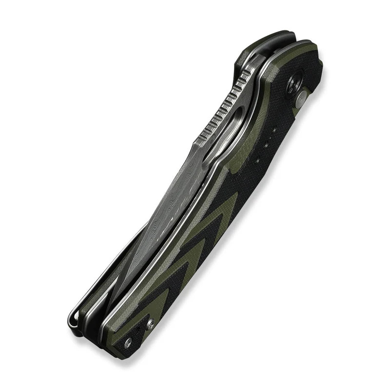 A markolat anyaga nagy teherbírású Fekete és zöld G10, amely egy üvegszállal erősített és műgyantával impregnált kompozit (olyan ipari laminátum, amely teljesen érzéketlen a nedvességre, a hőingadozásra és a legtöbb vegyszerre, így extrém környezetben sem vetemedik meg). A markolat felülete Milled Chevron mintázatot kapott (V-alakú precíziós marás), amely nemcsak esztétikailag teszi egyedivé a bicskát, hanem csúszásmentes fogást és magas fokú tapadást biztosít nedves környezetben vagy kesztyűben történő használat esetén is. A 108 mm zárt hosszúságú markolat ergonomikus kialakítása (az emberi kéz természetes formájához igazított formai megoldások) lehetővé teszi a biztonságos erőátvitelt, miközben a 13,0 mm-es vastagság garantálja a diszkrét hordozhatóságot. A belső szerkezetet rozsdamentes acél linerek merevítik (a markolatpanelek közé épített merevítő vázlemezek), amelyek biztosítják a kés szerkezeti stabilitását és a mechanikai alkatrészek pontos illeszkedését, miközben az eszköz összsúlya mindössze 107 gramm marad, ami ideális a folyamatos napi hordozáshoz.
