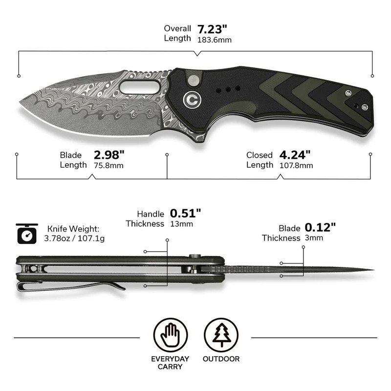 A technikai felszereltség csúcspontja a Civivi Vexron modellben a rendkívül biztonságos Button Lock zárszerkezet (egy nyomógombbal működtethető mechanizmus, amely a penge nyitott állapotában stabilan rögzíti az élt). Ez a rendszer nemcsak maximális biztonságot nyújt a véletlen becsukódás ellen, hanem lehetővé teszi a rendkívül gyors és könnyed kezelhetőséget egyetlen kézzel is. A penge nyitása a Flipper (a pengéből kiálló nyitófül) vagy a Thumb Hole (nyitólyuk) segítségével történik, amelyek selymesen sima futását a Caged Ceramic Ball Bearing (zárt kerámia golyóscsapágyas rendszer) garantálja a forgástengely körül. Ez a csapágyazás biztosítja az ellenállásmentes pengeindítást és a hosszú élettartamot a hagyományos megoldásokkal szemben, megakadályozva a szennyeződések bejutását a mechanikába. A bicska 184 mm teljes hosszúságú, hordozhatóságát pedig egy rozsdamentes acélból készült Deep Carry zsebklipsz segíti (mélyen a zsebben tartó rögzítő), amely átszerelhető a jobb és bal oldali hordozáshoz egyaránt, biztosítva a stabil viselést minden típusú ruházaton.