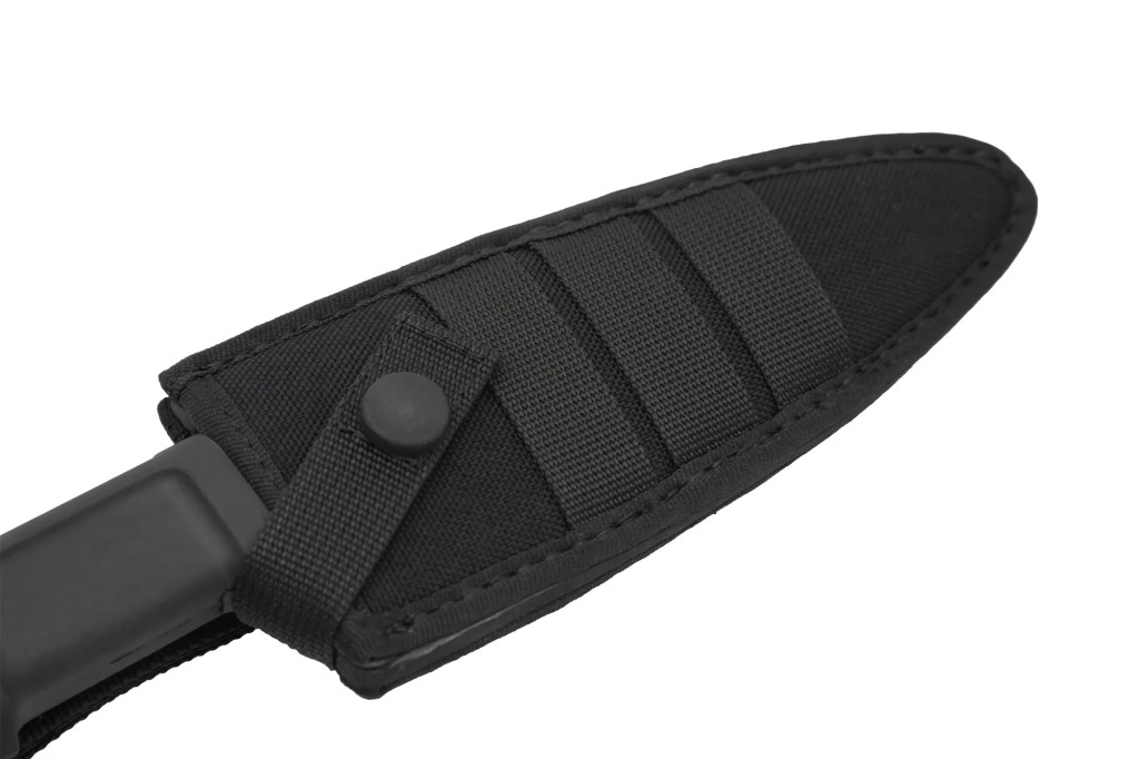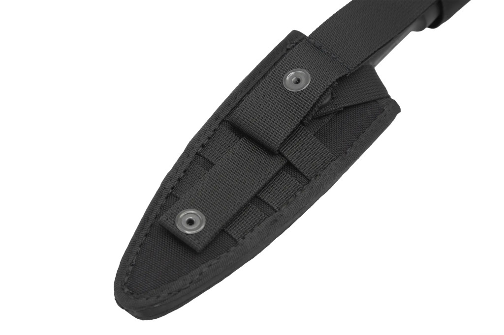 A penge hátoldalán található hüvelykujj-támasz tovább növeli a fogás stabilitását. Az ambidextrikus cordura tok időtálló kialakítású. A pengezár biztosítja a kés biztonságos szállítását. A tok mindkét oldalán található Molle rendszer segítségével: