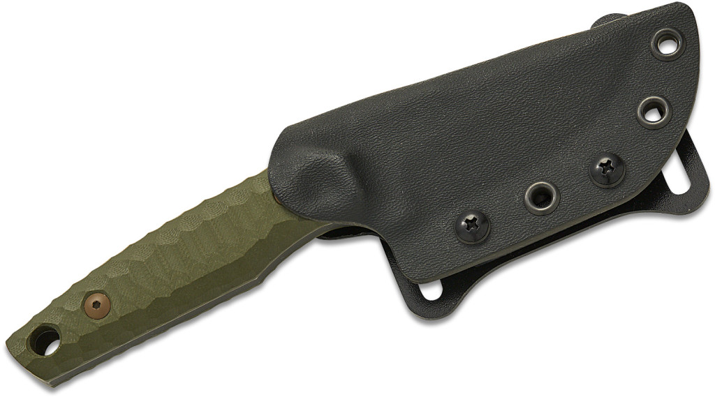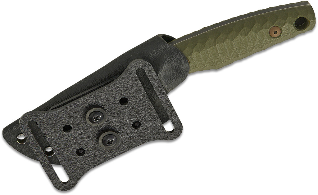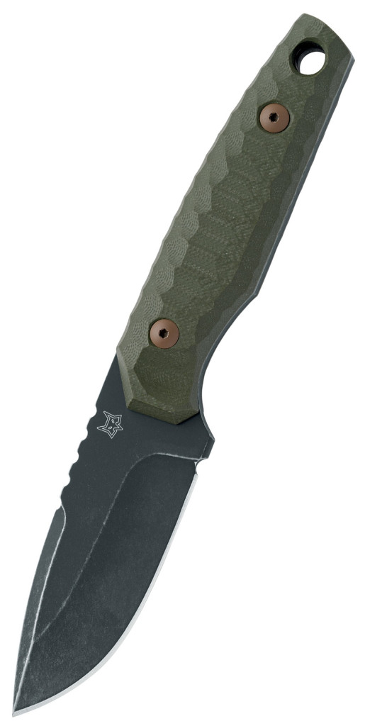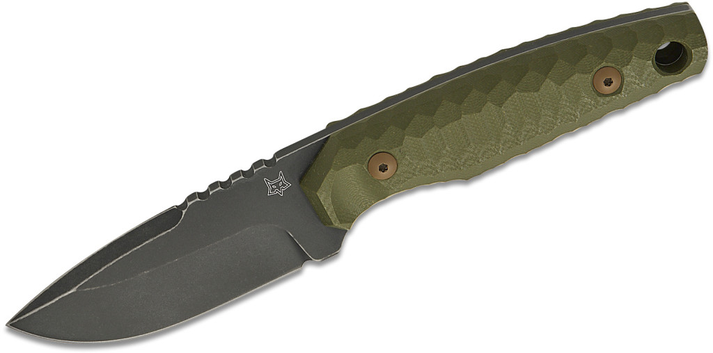 A FOX KS Niolox Black Blade OD G-10 markolata a rendkívül strapabíró G10 OD Green anyagból készült, amely üvegszál-erősítésű epoxigyanta laminátum, így teljesen immunis a vízre és a vegyi anyagokra. A markolat kialakítása során a tervező kiemelt figyelmet fordított a csúszásmentes fogásra, biztosítva a stabilitást esős időben vagy kesztyűben végzett munka során is. Az ergonomikus kialakítás (az emberi kéz természetes anatómiájához igazított forma) különlegessége, hogy támogatja a speciális reverse grip (fordított fogás, ahol a penge a tenyér alja felé mutat) technikát is, ami kritikus lehet taktikai helyzetekben. A paneleket Coyote idroglider AISI 303 rozsdamentes acél csavarok rögzítik, amelyek idroglider bevonata (egy teflon-alapú korrózióvédő réteg) megvédi a rögzítőelemeket az oxidációtól. A full-tang felépítés (ahol a penge acélja teljes szélességében és hosszában végigfut a markolatpanelek között) garantálja a fix pengés kés törhetetlenségét a legintenzívebb terhelés mellett is, hosszú távú szerkezeti integritást biztosítva a teljes eszköznek.