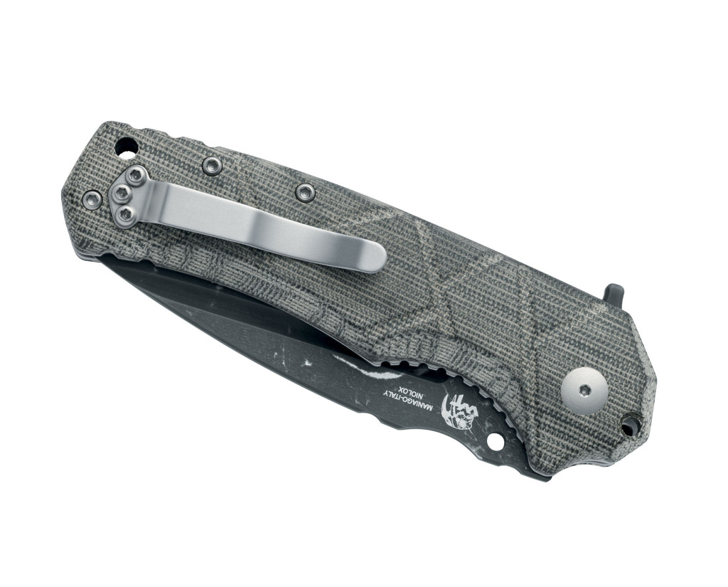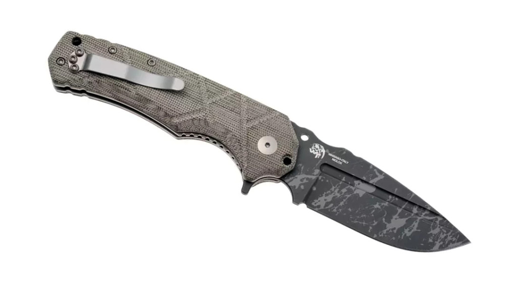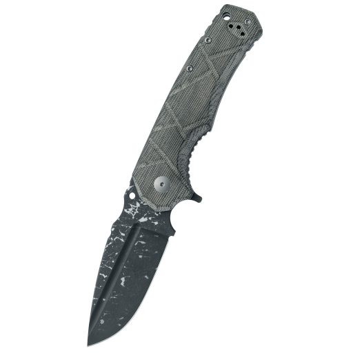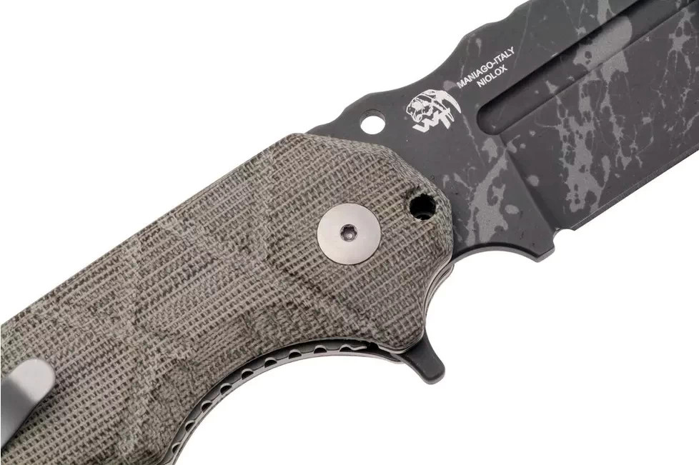 A markolat technikai kialakítása a maximális tartósságra és a minden körülmények között biztos fogásra fókuszál, alapanyaga OD green canvas Micarta. A Micarta egy műgyantával impregnált szövetrétegekből álló kompozit laminátum, amely rendkívül ütésálló, és nedves környezetben is garantálja a csúszásmentes fogást, mivel a rostok textúrája javítja a tapadást a tenyérben, függetlenül a külső hőmérséklettől. A markolat szerkezeti stabilitását a fekete G10 távtartó (üvegszál-erősítésű epoxigyanta, amely a markolatpanelek közötti távolságot rögzíti a háti részen) fokozza, biztosítva a váz torziós merevségét nehéz igénybevétel során, elkerülve a szerkezet vetemedését. Az ergonomikus kialakítás (az emberi kéz természetes anatómiájához és fogásához igazított tervezési elv) a panelek mély textúrájával együtt segíti a pontos erőátvitelt és csökkenti a kéz fáradását hosszan tartó munka mellett. A markolat belső részén elhelyezett rozsdamentes acél vázlemezek (linerek) adják meg a teljes szerkezet fizikai szilárdságát, megvédve a zsebkést a deformációtól a komolyabb feszítések során is. A markáns formatervezés és a markolat végén kialakított zsinórfurat (speciális nyílás csuklószíj vagy biztosító kötél átfűzéséhez) együttesen biztosítják a szerszám feletti folyamatos kontrollt intenzív használat közben. Az URO markolata kifejezetten a stabil, úgynevezett "kalapácsfogáshoz" lett optimalizálva, ami elengedhetetlen a nagy erejű vágási feladatoknál.