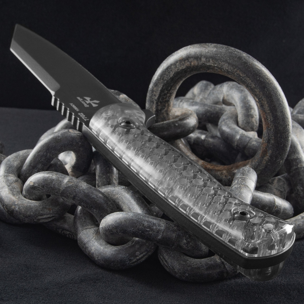 A gyártói adatok szerint a kés teljes hossza 239 mm, a penge hossza 117 mm, amely jó arányt ad a precíz irányítás és a stabil használhatóság között. A penge vastagsága 4,76 mm, ami komoly merevséget biztosít, különösen a reverse tanto hegyforma esetében. A penge anyaga 1095 Cro-Van, a keménységérték 56–58 HRC, amely kiegyensúlyozza a tartósságot és az élezhetőség könnyedségét. A kés tömege 203 g, a tokkal együtt megközelítőleg 272 g, így hordása stabil, de nem válik túlzottan nehézzé. A markolat anyaga áttetsző polimer, amely nem csupán egyedi megjelenést biztosít, hanem funkcionális fogást is, mivel a felülete texturált a biztonságos tartás érdekében. A teljes tangos kialakítás növeli az ellenállóképességet, különösen akkor, ha a kés erős, lefelé irányuló terhelést kap.