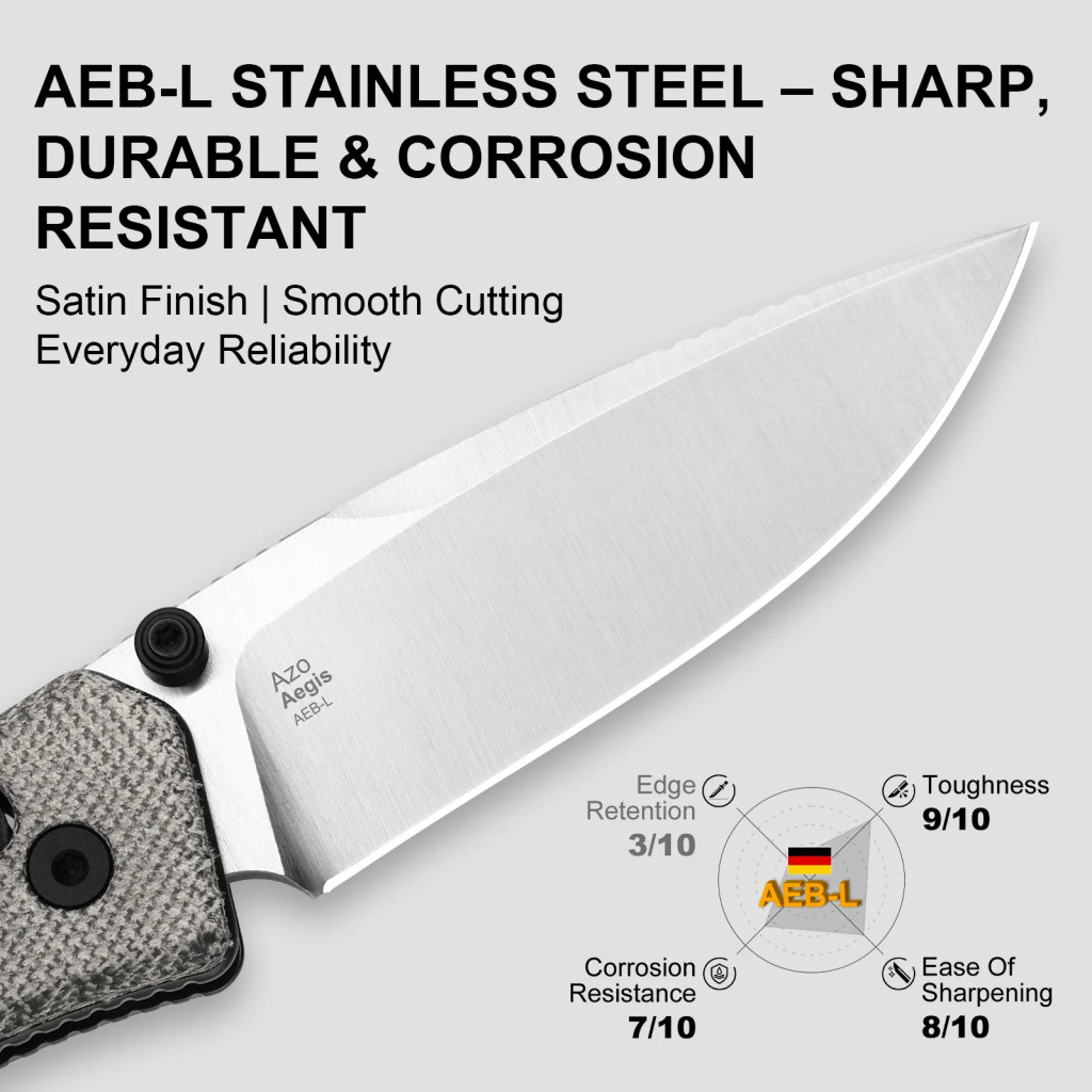 Az Aegis pengéje AEB-L rozsdamentes acél — az egyik legnépszerűbb acélfajta, amely jó él-tartással, kiváló korrózió-állósággal és viszonylagos könnyű karbantarthatósággal rendelkezik. A penge formája drop point, sima élkiképzéssel („plain edge”), ami kiegyensúlyozott hegypontot és megbízható, használható vágóéletet ad, legyen szó csomagolás bontásáról, szeletelésről, vagy mindennapi EDC-feladatokról. A penge vastagsága 2,8 mm, ami jó arányt teremt a merevség és a használhatóság között. A markolat fekete Micarta — strapabíró, kopás- és időjárásálló kompozit, amely textúrájának köszönhetően biztos, csúszásmentes fogást ad még nedves vagy hideg kezek esetén is. A nyitás hüvelykujj-studbal történik (easy thumb stud), a zármechanika pedig Clutch Lock — ez stabil, megbízható zárást kínál nyitott állapotban, így a penge nem mozdul el véletlenül munka közben. A zsebklip „deep-carry”, megfordítható — tehát diszkrét hordást tesz lehetővé, és jobb- vagy balkezes viseléshez is alkalmas.