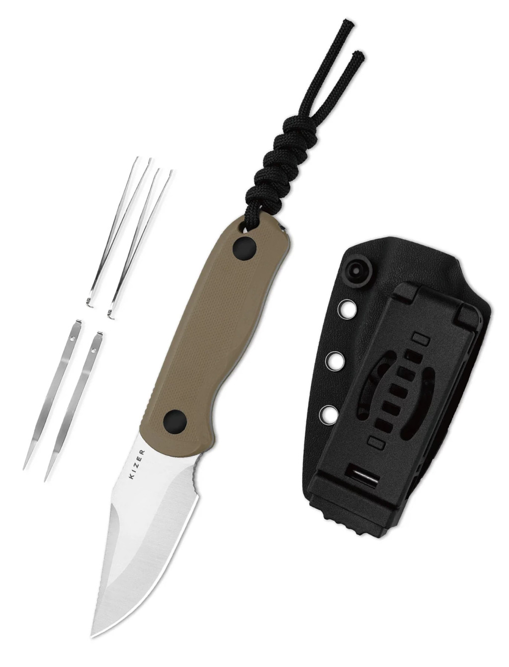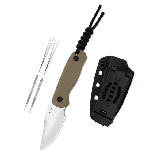 A kés teljes hossza 153,30 mm, a penge hossza 66,00 mm, a vastagsága 3,0 mm, és a tömege 76,3 g. A penge felülete satin finish (selyemfényű polírozás), amely letisztult megjelenést biztosít, és csökkenti a fényvisszaverődést, így diszkrétebb megjelenést ad használat közben. A keménység körülbelül HRC 58-60, ami megfelelő egyensúlyt teremt az éltartás és az élezhetőség között. A penge típusa clip point: a hegyrész éles és „csúcsos” kialakítású, amely jól használható precíz vágásokhoz, és a síkköszörülés (flat grind) miatt hatékony a mindennapi feladatokban is. A markolat anyaga G10 — tartós, víz- és nedvesség-álló laminátum, ergonomikus és stabil fogást ad. A kydex tok gyors hozzáférést és biztonságos hordást biztosít – akár bandázsban, felszerelésen vagy övön is.
