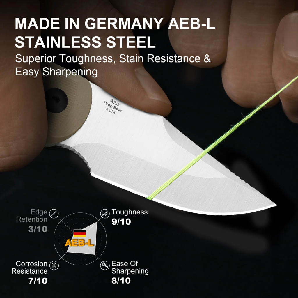 A Drop Bear Fix 1092A2 kiváló választás azok számára, akik egy megbízható, kompakt fixpengés kést keresnek – legyen szó mindennapi hordásról (EDC), túrázásról, kempingezésről vagy gyors beavatkozást igénylő feladatokról. A clip point pengeforma és az AEB-L acél kombinációja lehetővé teszi a precíz vágást és könnyű karbantartást — a síkköszörülés miatt az él gyorsan újraélezhető. A G10 markolat biztos fogást ad még nedves kezekkel is, míg az 76,3 g-os tömeg alacsony terhelést jelent hordás közben. A melyen hordható formában kialakított kydex tok révén a kés mindig kéznél van – övön, felszerelésen vagy zsebbe rejtve. Akik értékelik az anyagminőséget, letisztult formát és hordhatóságot, azoknak ez a modell tartós társ lesz.