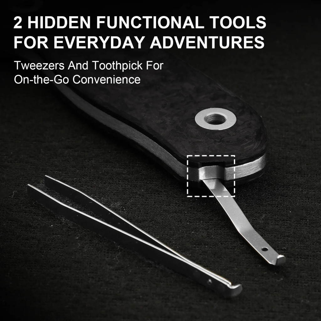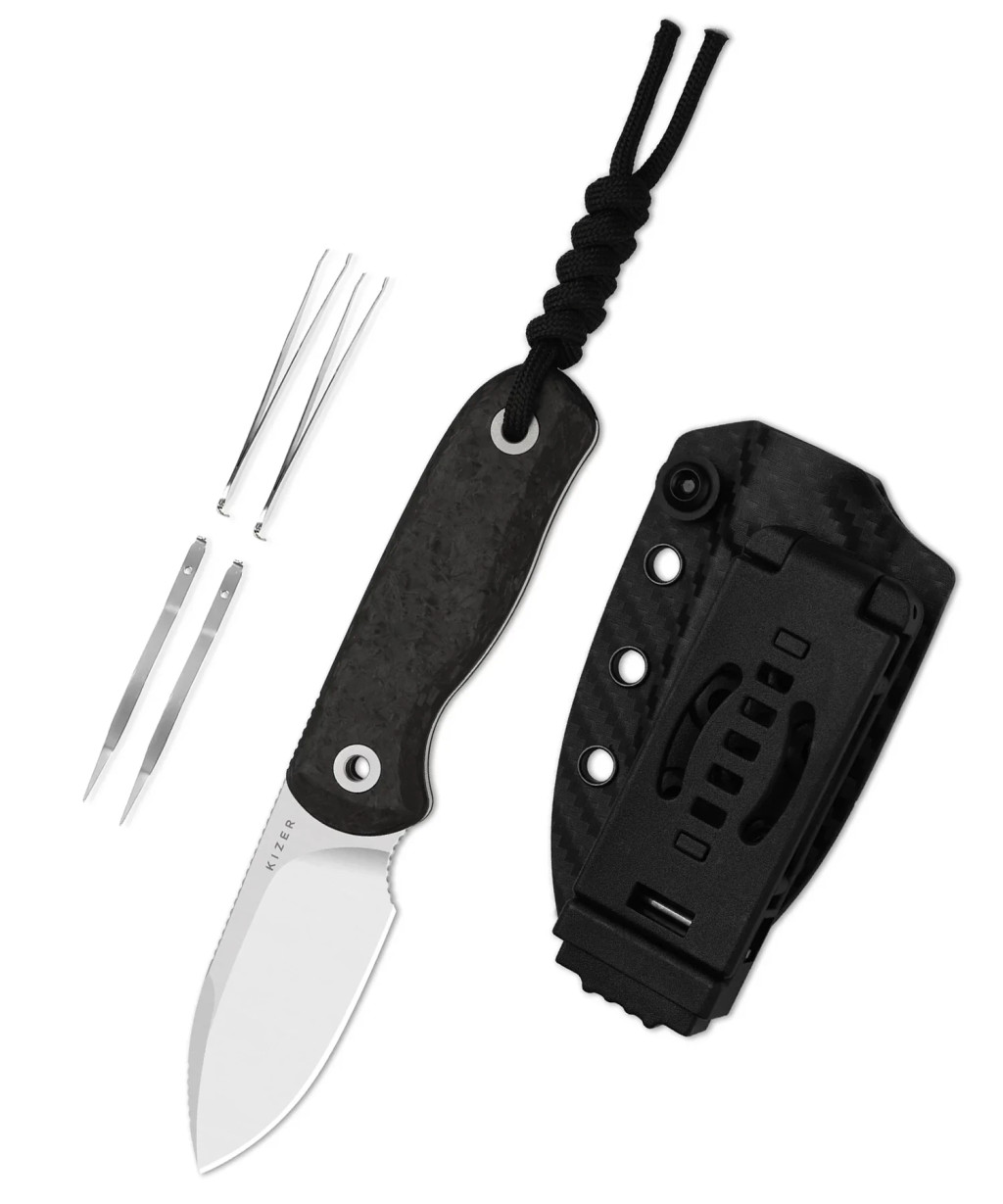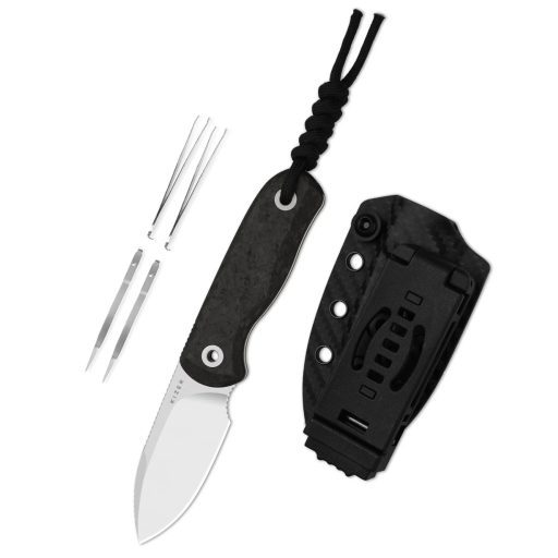 A modell minden részletében prémium; a penge anyaga Böhler M390, amelyet „King of Steel” („az acélok királya”) jelzővel is illetnek, köszönhetően a kivételes kopás- és éltartásának. Ez az anyag magas széntartalmú, mikrószemcsés struktúrájának köszönhetően hosszú ideig megtartja az élét még intenzív használatban is. A pengeforma drop point („leeresztett hegy”) — a hegyrész enyhén lecsapott, így kiváló kontrollt ad vágáskor, miközben stabil hegykialakítással rendelkezik. A köszörülés típusa flat grind (síkköszörülés): a penge teljes szélességében a gerinctől az él felé fokozatosan vékonyodik, ezáltal gördülékeny vágást és hatékony teljesítményt kínál. A markolat anyaga karbonszálas (Carbon Fiber) — könnyű, mégis rendkívül merev és tartós, ami a kés egész konstrukcióját könnyedén hordhatóvá teszi. A full-tang kialakítás — a penge acélmagja végigfut a markolatban — további stabilitást és hosszú távú megbízhatóságot biztosít. A hordozást egy kydex tok támogatja, amely víz- és kopásálló, övre rögzíthető és gyors hozzáférést biztosít.