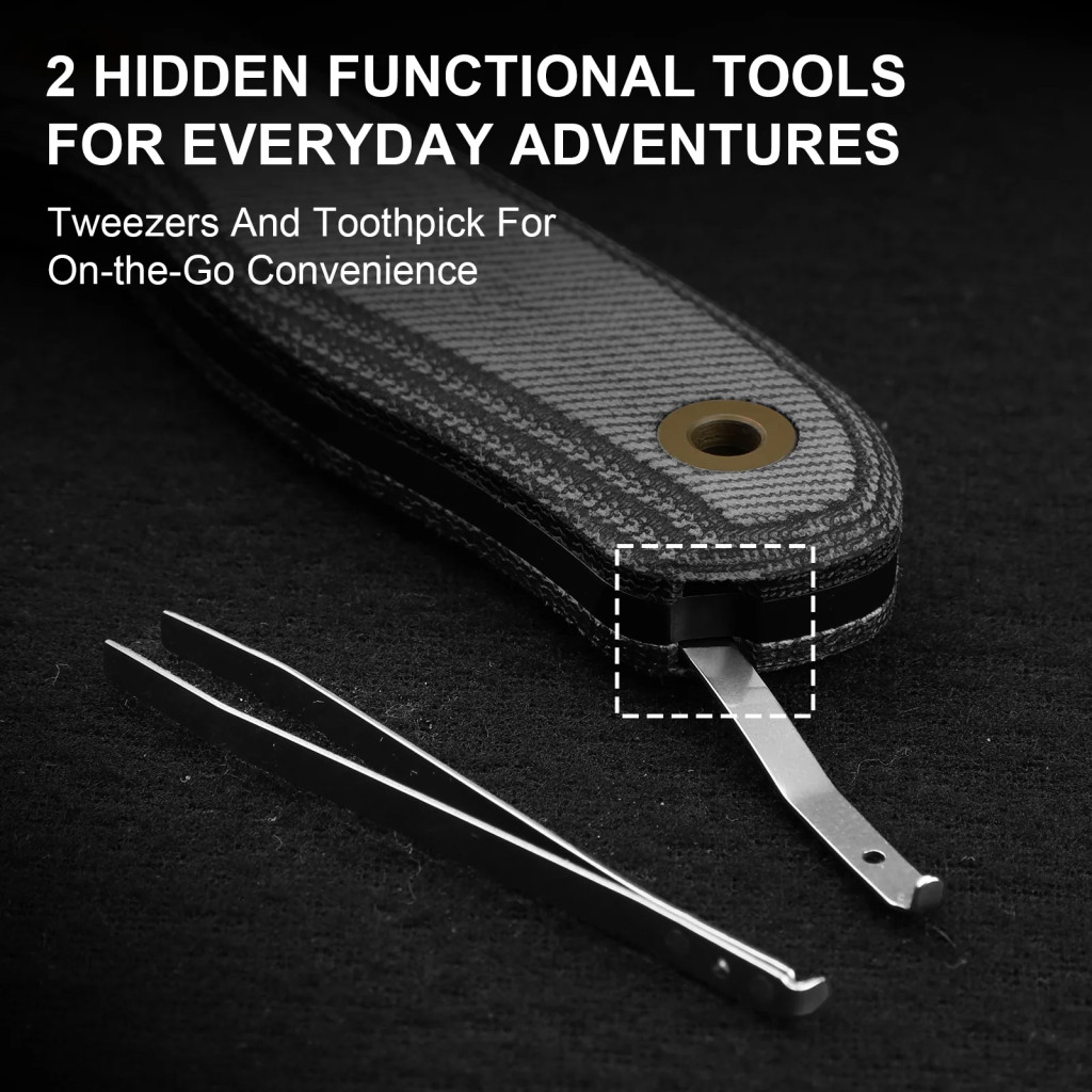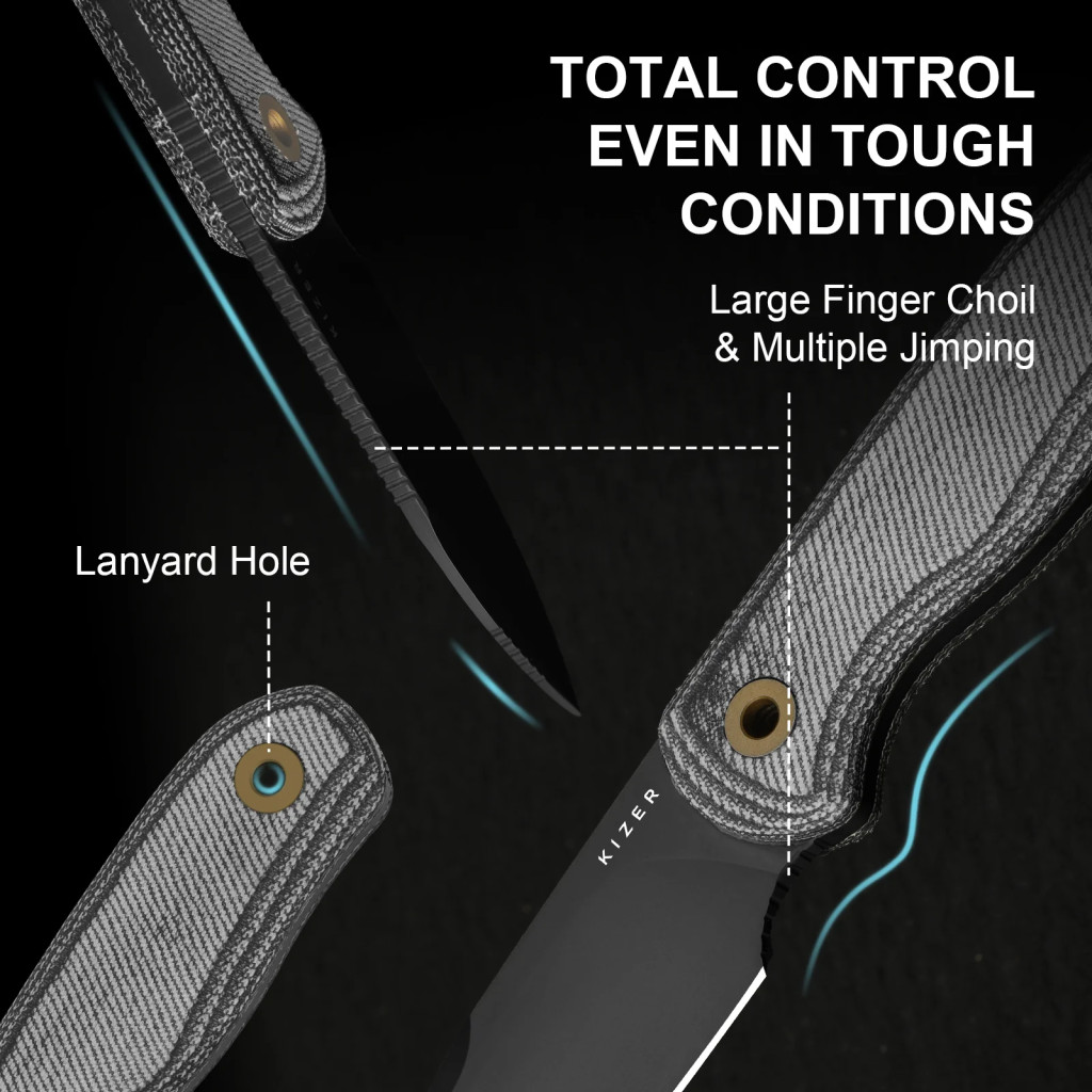 Ez a modell részleteiben is prémium: a penge anyaga S45VN rozsdamentes acél, amelyet a felhasználók magas szinten értékelnek a kopás-, ütés- és korrózióállósága miatt. A pengeforma drop point, azaz a hegyrész enyhén ívelt, amely sokoldalú vágó- és metsző munkákhoz biztosít stabil hegykialakítást, miközben a köszörülés típusa flat grind (síkköszörülés): a penge a gerinctől az él felé fokozatosan vékonyodik, így gördülékeny vágást és hatékony vágást biztosít. A markolat anyaga Micarta®, egy természetes rostokkal és gyantával készített kompozit laminátum, amely tartós, vízálló és biztos fogást nyújt még használat közben is. A konstrukció full-tang felépítésű, vagyis a penge acélteste végigfut a markolatban, biztosítva a hosszú távú stabilitást és megbízhatóságot. A hordhatóságot a mellékelt tok is segíti, amely merev kialakításával biztonságosan rögzíti a kést.