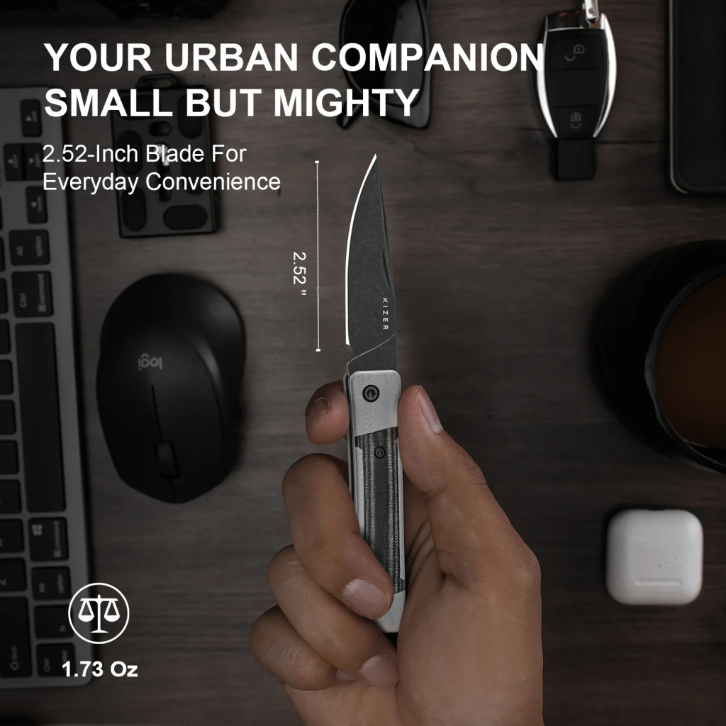A kés teljes hossza nyitott állapotban 145 mm, zárt állapotban körülbelül 81 mm; a markolat hossza 81 mm. A penge hossza 64 mm, vastagsága 2,5 mm, acélja Nitro-V, keménysége 60–61 HRC. A kés súlya 49 g — ez rendkívül könnyűvé teszi, így zsebben hordva szinte észrevehetetlen. A penge drop-point profilja és flat grind csiszolása biztos vágóéletet és precíz vágásokat tesz lehetővé, a black stonewashed felület pedig előnyös, ha a kés sokat van használva, hiszen nyomot nem hagy túl feltűnően. A G10 + Micarta markolat ergonomikus, textúrált és tartós — a kompakt méretek és alacsony súly együtt kényelmes, mindennapi hordást és megbízható használatot garantálnak. A kialakítás célja egy olyan „gentleman’s knife / EDC” darab volt, ami nem robosztus túlélőeszköz, hanem könnyű, elegáns és praktikus zsebkés — pont azoknak, akik értékelik a minőséget, a kompakt méretet és a diszkrét stílust.