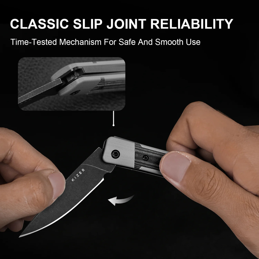 A penge anyaga Nitro-V rozsdamentes acél, amelyet a gyártó 60–61 HRC közötti keménységgel edzett — így jó él-tartást, korrózióállóságot és tartósságot kínál. A penge hossza 64 mm, vastagsága 2,5 mm, és formája drop point, sima élkiképzéssel („plain edge”). Ez a kombináció kiegyensúlyozott hegypontot és megbízható, univerzális vágóéletet ad — ideális csomagolás bontására, mindennapi szeletelésre, kisebb vágási vagy előkészítő feladatokra. A penge felülete black stonewashed (fekete kőmosott) — ez a finis elegáns, mégis visszafogott, és segít elrejteni az apró használati kopásokat. A markolat G10 + Micarta, ami strapabíró, kopás- és időjárásálló, továbbá textúrája miatt biztos, csúszásmentes fogást biztosít még nedves vagy hideg kéz esetén is. A nyitás klasszikus nail-nick visszahúzó horonnyal történik, a mechanika slip-joint, azaz nincs zár — ez visszafogott, klasszikus működést ad, és egyszerű, megbízható nyitást-zárást.