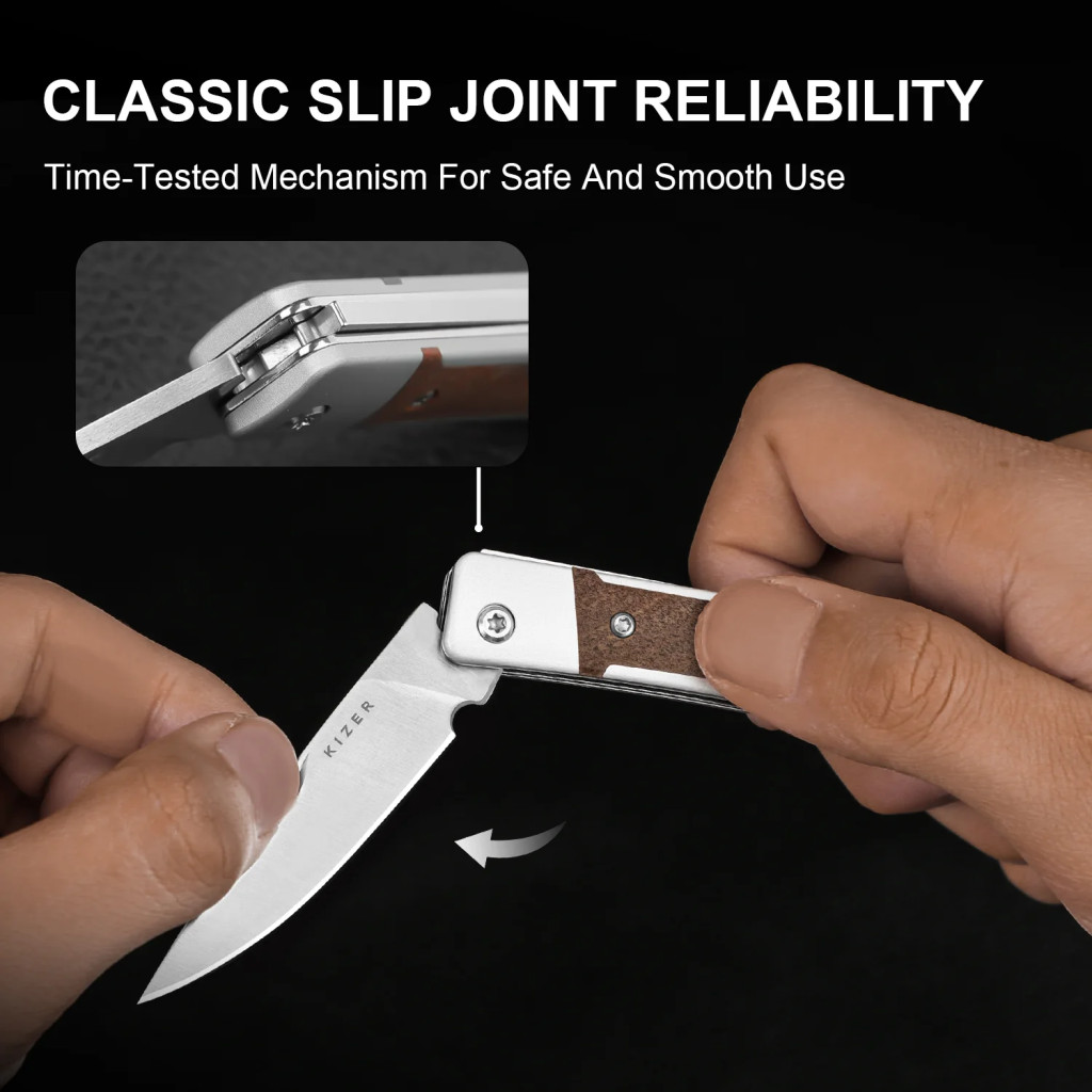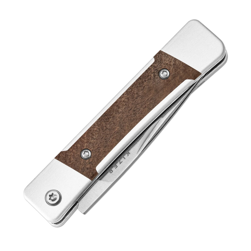 A kés teljes hossza 145 mm, zárt állapotban 81 mm, a penge hossza 64 mm, vastagsága 2,5 mm, acélja Nitro-V, amely a gyártó szerint kiegyensúlyozott él-tartást és stabil vágóteljesítményt biztosít. A penge csiszolása flat grind, ami egyenletes, jól kontrollálható vágóélt eredményez, a drop point forma pedig precíz hegypont-irányítást tesz lehetővé. A markolat anyaga mkuruti wood és alumínium, a markolat hossza 81 mm, amely kompakt, mégis biztos fogást ad. A kés tömege mindössze 51,5 g, így kifejezetten könnyű, zsebben és ingzsebben is kényelmesen hordható. A slip-joint mechanika előnye, hogy finoman mozog, nem igényel erőkart vagy zárkioldót, és megfelel olyan helyzetekben is, ahol a záras kések kevésbé elfogadottak. A konstrukció illesztései pontosak, a penge rugója határozott, a markolat textúrája természetes és ergonomikus — a kés összességében harmonikus, könnyű és használatra kész.