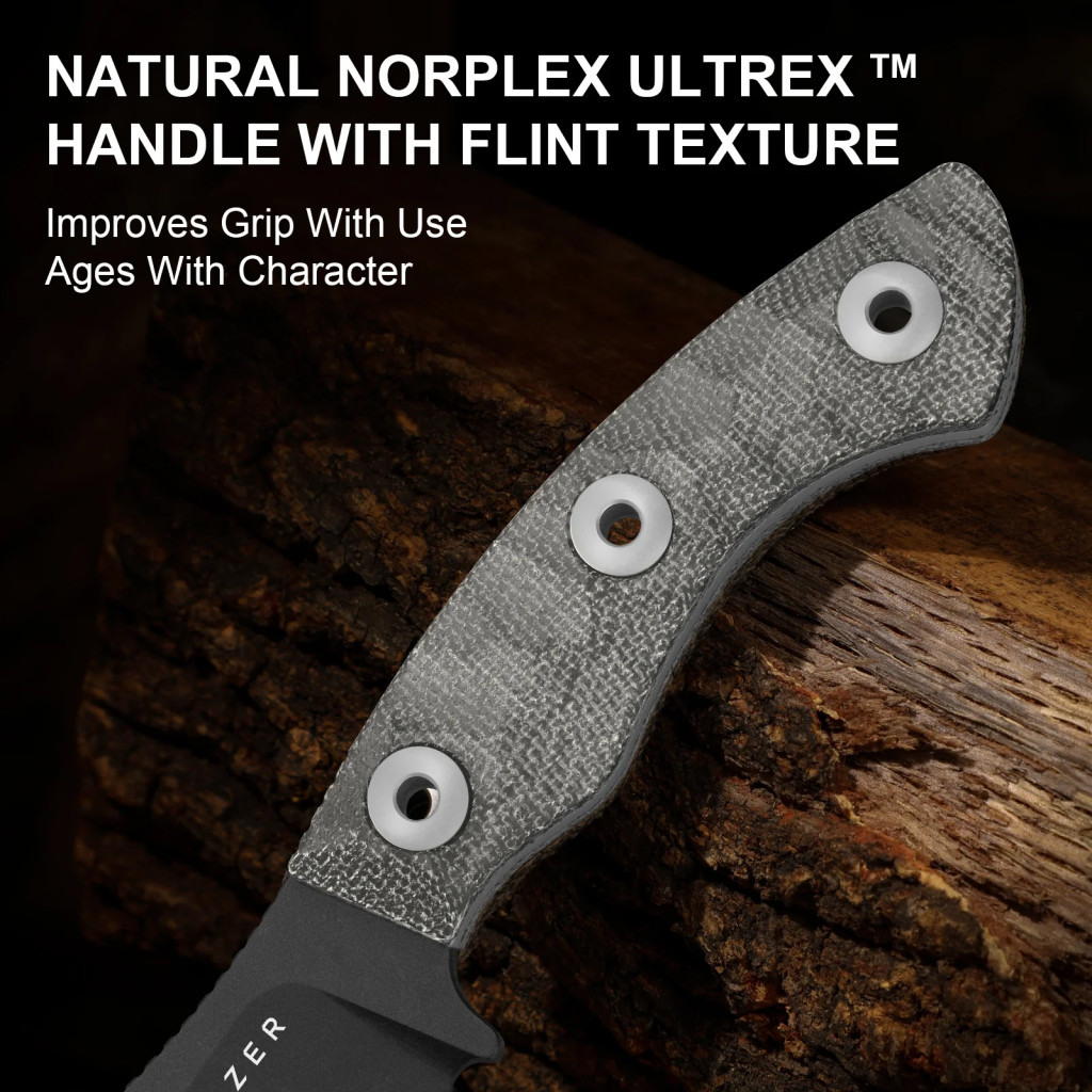 A modell részletes műszaki kivitelében is kiemelkedik: a penge anyaga háromrétegű kompozit acél — a mag 100Cr18MoVCo acél, amely kiváló éltartást biztosít, és mindkét oldalán rugalmasabb acélrétegek helyezkednek el, így a penge egyszerre kemény és szívós. A pengeforma „Nessmuk-style”, ami a klasszikus drop-point továbbgondolása: jellegzetes hasívvel, emelt hegyrésszel és mély vágóéllel rendelkezik — ideális faragáshoz, előkészítéshez vagy könnyebb bushcraft feladatokhoz. A köszörülés flat grind (síkköszörülés) — ez azt jelenti, hogy a penge teljes vastagsága mentén a gerinctől az él felé fokozatosan vékonyodik, ezzel gördülékeny vágást és hatékony használatot tesz lehetővé. A markolat Norplex UltreX™ Micarta — természetes rostok és gyanta alapú kompozit, amely kezdetben texturált felületének köszönhetően azonnali és biztos fogást kínál, és használattal mintázata karakteressé válik. A full-tang konstrukció biztosítja, hogy az acélmag végigfut a markolatban, maximális struktúrális stabilitást adva. A jimping a penge gerincén gondoskodik a stabil fogásról részletes munkáknál, és a kydex tok övre rögzíthető hordást biztosít.