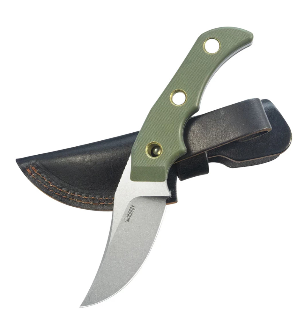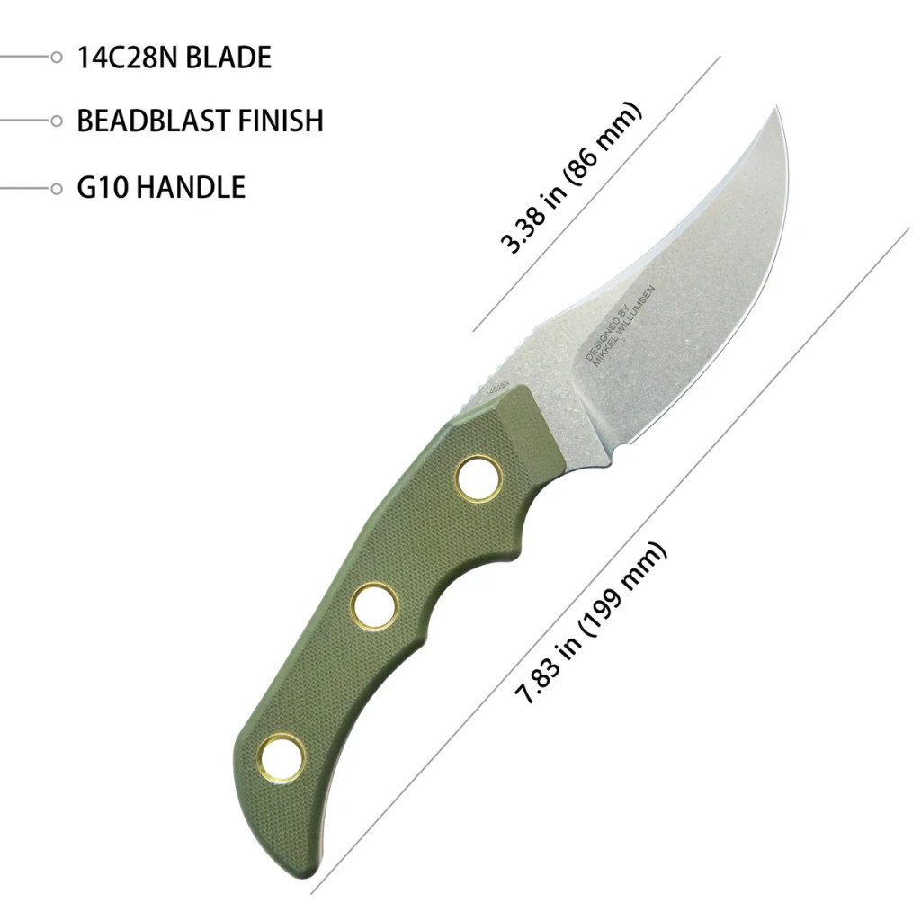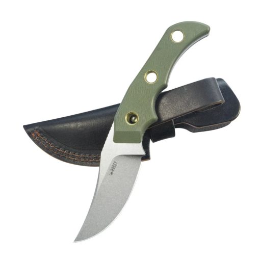 A penge anyaga 14C28N rozsdamentes acél, amely kiváló kopásállósággal és éltartással rendelkezik. Felülete beadblast (homokfúvott), ami matt, visszafogott megjelenést és kopásálló hatást biztosít. A formája clip point, mely jól kiegyensúlyozott hegyet és hosszabb vágóélt kínál, ideálisan szolgál mindennapi feladatokra. A penge él kialakítása flat grind (lapos köszörülés), ami egyenletes vágási teljesítményt eredményez. A markolat zöld G‑10 kompozit, amely üvegszállal erősített műgyanta – könnyű, tartós és biztonságos fogást ad. Zármechanizmus nincs, mivel fixpenge kialakítású eszköz. A tok bőr, amely klasszikus és elegáns megjelenést ad.