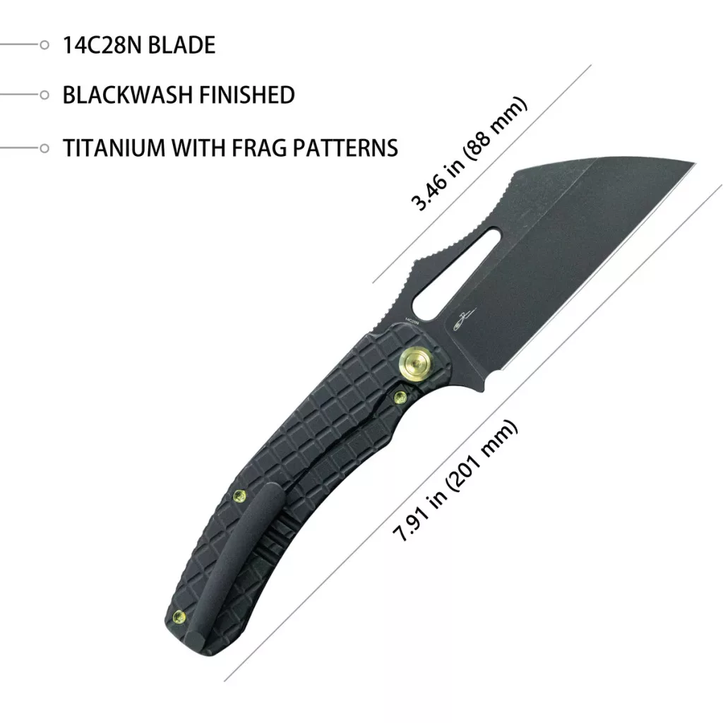 A penge 14C28N rozsdamentes acél, amely kiemelkedő éltartást és jó korrózióállóságot biztosít. A pengeforma Wharncliffe, hosszú egyenes éllel és erős hegyvégzéssel, mely precíz vágásra optimalizált. A felület kezelése blackwash, ami matt, sötétített megjelenést kölcsönöz, és praktikus is, mivel jól elfedi a használat nyomait. A markolat 6AL‑4V titánból készült, amely könnyű, ugyanakkor rendkívül robusztus felépítést biztosít. A nyitás körhüvelykujj‑nyílással (thumb hole) történik, sima egykezes használatot tesz lehetővé. A penge zárását a frame lock rendszer garantálja, amely megakadályozza a véletlen bezáródást használat közben.