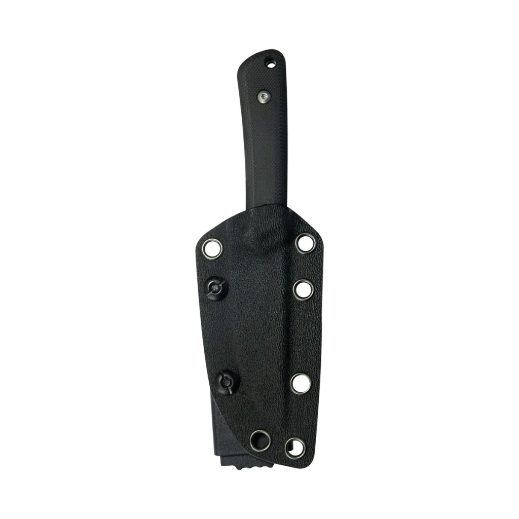 A markolat panelei nagy sűrűségű Fekete G10 anyagból készültek, amely egy üvegszállal erősített és műgyantával impregnált kompozit (olyan ipari laminátum, amely teljesen érzéketlen a nedvességre, a hőingadozásra és a legtöbb vegyszerre, így extrém környezetben sem vetemedik meg). A Thorn modell egyik legfontosabb jellemzője a Full Tang felépítés (olyan kialakítás, ahol a penge anyaga a markolat teljes hosszában, azaz 155 mm hosszon végigfut), ami garantálja az eszköz elpusztíthatatlanságát és a maximális szerkezeti stabilitást nehéz fizikai igénybevétel során is. A markolat rögzítéséről fekete PVD bevonatú rozsdamentes acél csavarok gondoskodnak (Physical Vapor Deposition – vákuumban végzett fémgőzöléses eljárás, amely extrém kemény és kopásálló réteget képez a felületen). A mindössze 70 grammos súly és az 11 mm markolatvastagság biztosítja a tökéletes egyensúlyt, minimalizálva a kéz fáradását a hosszan tartó munkavégzés során, miközben az ergonomikus ujjvájatok csúszásmentes kontrollt garantálnak.