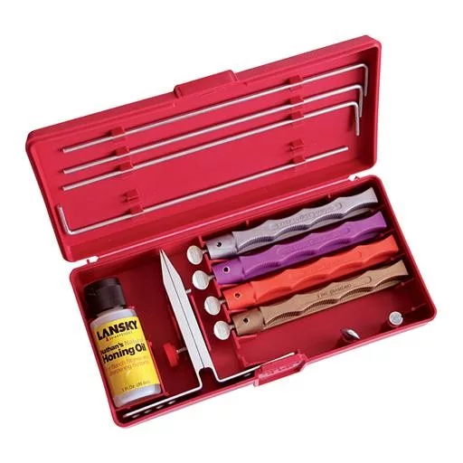 Comes with precision multi-angle. flip-over knife clamp. sharpening hones on color coded finger grooved safety holders. one guide rod for each stone. specially formulated honing oil. and extra long knife clamp screws.