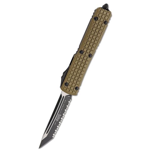 MICROTECH Ultratech az évek folyamán rengeteg módosításon ment keresztül és minden alkalommal hatékonyabbá és megbízhatóbbá vált. Ebben a verzióban az ügyes, kontúrozott markolatot fejlesztették tovább ami ebben az esetben G-10 és aluminium. Pengéje M390 csúcsacélból készült, fekete csillogásmentes bevonatot kapott és jelen esetben tanto pengeformát mely végig fogazott. Viselését klipsz segíti elő mely jellemzően nem szerelhető át. A markolat végén a jellegzetes üvegtörő található