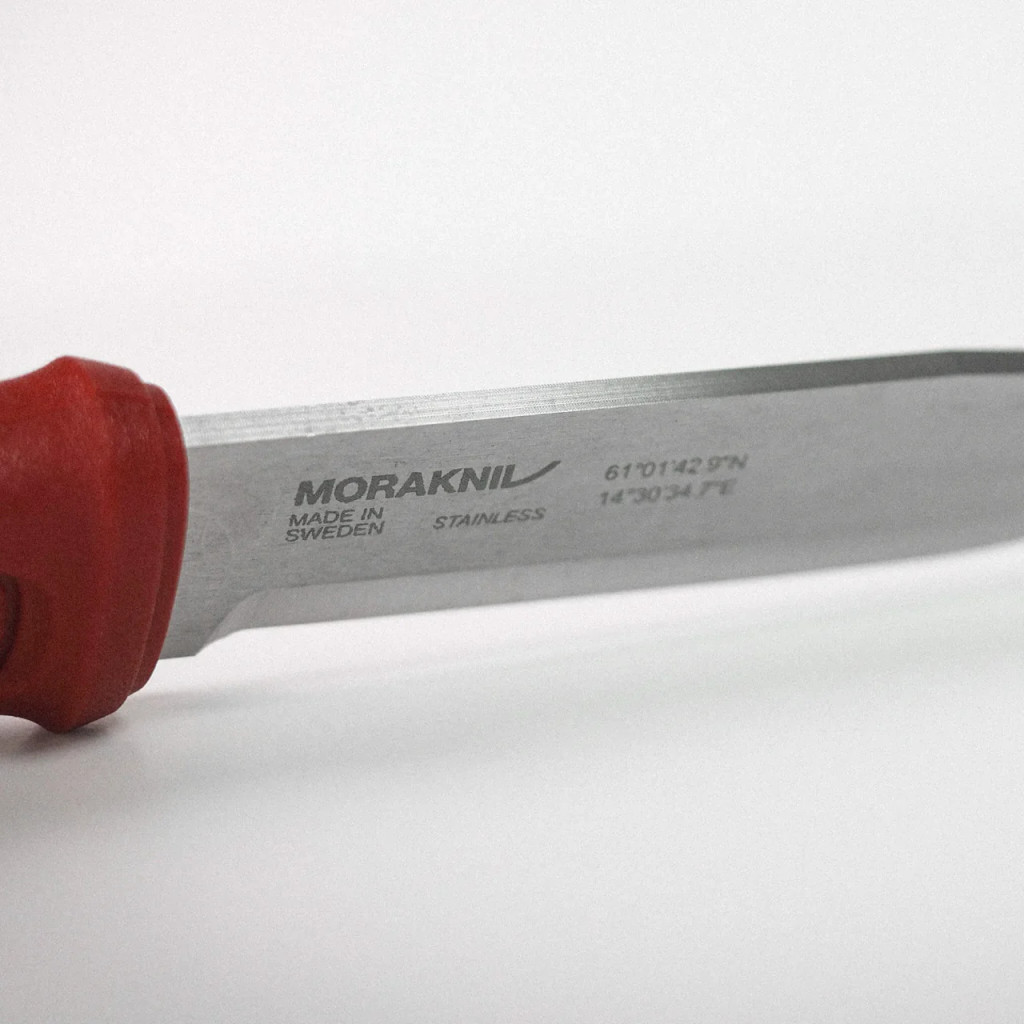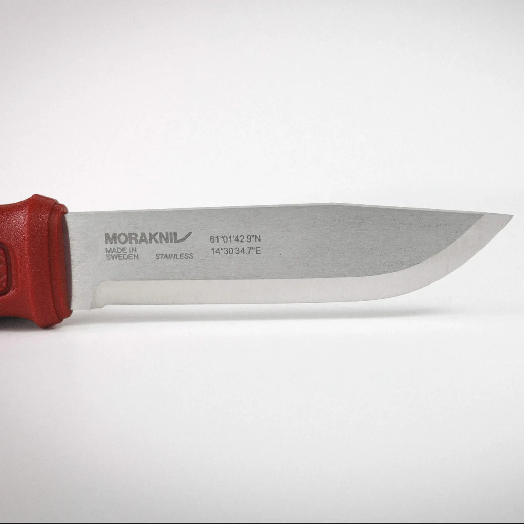 A Morakniv Garberg Dala Red Edition pengéje egy különleges technikai részletet is rejt: a gyár eredetét igazoló logók mellett a pengébe gravírozva megtalálhatóak a Mora gyár pontos GPS koordinátái is (61∘00′44′′N,14∘32′40′′E), ami a svéd gyártás iránti elkötelezettség exkluzív védjegye. Az ergonómia jegyében megalkotott, jellegzetes Dala-vörös színű markolat strapabíró poliamid (nagy teherbírású, ütésálló és időjárásálló műanyag kompozit) anyagból készült, amely ellenáll a szélsőséges hőmérsékleti hatásoknak. A felületen található rombusz mintázat (apró, geometrikus textúra a markolaton) biztosítja a csúszásmentes fogást és a pontos irányítást még nedves, sáros körülmények között is. A markolat formája szimmetrikus, így jobb- és balkezesek számára is kényelmes, míg a markolat végén elhelyezett zsinórfurat (lanyard hole) további rögzítési lehetőséget kínál. A markolatból kinyúló full tang vég (a markolat végén látható acéldarab) praktikus törőfelületként vagy kalapácsként is használható vészhelyzetben, garantálva a biztonságos munkavégzést.
