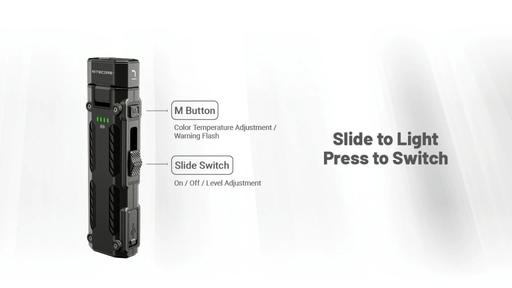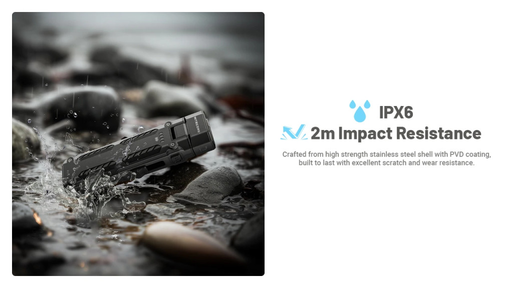 A PVD bevonatos rozsdamentes acél ház, az IPX6 vízállóság, a 114 g tömeg és a 17 mm szélesség egy rendkívül strapabíró, mégis könnyen hordható EDC lámpát eredményez, amely megbízható társ a mindennapokban és kültéri környezetben egyaránt.