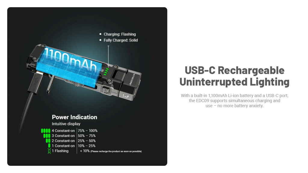Az energiaellátásról egy beépített 1100 mAh-s lítium-ion akkumulátor gondoskodik. A töltöttségi szintet négy zöld LED jelzi, részletes visszajelzéssel. Töltése USB-C csatlakozón keresztül történik, a csatlakozó víz- és porvédett fedél alatt kapott helyet. Teljes feltöltés kb. 1 óra 20 perc, és a lámpa töltés közben is használható. A mellékelt szilikon diffúzor kupak segítségével az EDC09 pillanatok alatt kempinglámpává alakítható.
