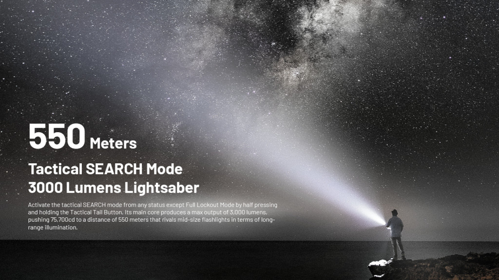 A készülék háza 7075-T6 alumíniumötvözetből készült, ami katonai szabványú HA III eloxált bevonattal és IP68 por- és vízállósággal rendelkezik — ez azt jelenti, hogy akár víz alatt is használható rövid ideig, és ellenáll a nehéz környezeti hatásoknak. A Rapid Lock™ mechanikus zár és a kétfokozatú kapcsoló extra biztonságot ad, megakadályozva a véletlen bekapcsolást. A lámpa mindezek mellett ütésálló és stabil, így kültéri vagy taktikai feladatokhoz is kifogástalan választás.