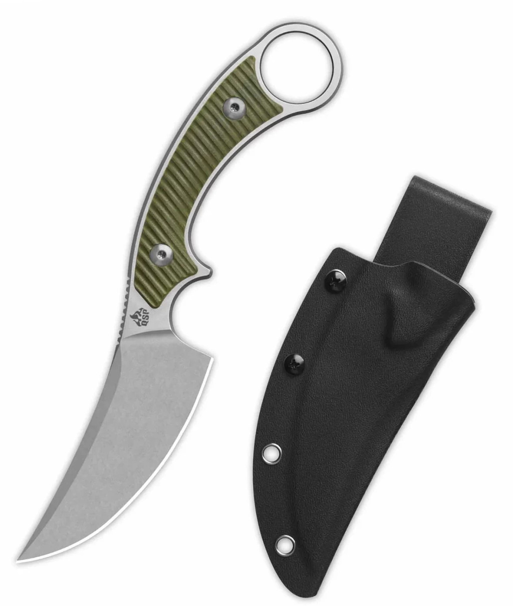 A QSP Viper teljes hossza összesen kb. 215 mm, a penge hossza kb. 100 mm, vastagsága pedig kb. 4,5 mm — ezek az arányok stabil pengetestet adnak, ami merev, tartós és alkalmas komolyabb használatra is. A penge acél keménysége körülbelül 59–61 HRC, ami megbízható él-tartást jelent, de nem túl rideg — így élezése is viszonylag egyszerű. A markolat anyaga G10, amely strapabíró és könnyű; a kés tömege a gyártói adatok szerint kb. 120 g (tok nélkül), ami ebben a méretben elfogadható kompromisszum a merevség és a hordhatóság között. A késhez egy Kydex tok tartozik, amely biztonságos hordást biztosít, és elősegíti a kés kényelmes viselését a felszerelésen vagy övön.