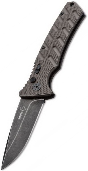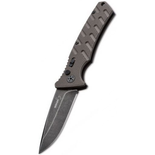 A kés vágófelülete AUS-8 rozsdamentes acélból készül, amely egy japán fejlesztésű, kiemelkedő szívósságú (az anyag ellenálló képessége a mechanikai behatásokkal, például töréssel szemben) ötvözet. Ez az acéltípus kiváló korrózióállósággal rendelkezik, és a felhasználó számára is könnyen újraélezhető, ami elengedhetetlen a hosszan tartó terepmunka során. A 8,5 cm hosszú penge Drop Point (olyan pengeforma, ahol a kés háta fokozatosan ível lefelé a hegy irányába, növelve a vágóél felületét) kialakítású, ami sokoldalú irányíthatóságot biztosít. A teljes pengefelület Stonewash (koptatott felületkezelés, amely hatékonyan rejti el a használati karcokat és csökkenti a fényvisszaverődést) borítást kapott. A penge aktiválásáért egy erős rugós automata mechanizmus felel, amely a nyomógomb (push button) megnyomásával azonnal és stabilan rögzíti a pengét munkára kész állapotban. A 3 mm-es pengevastagság garantálja a stabilitást, elkerülve a penge deformálódását nagyobb erőkifejtés esetén is.