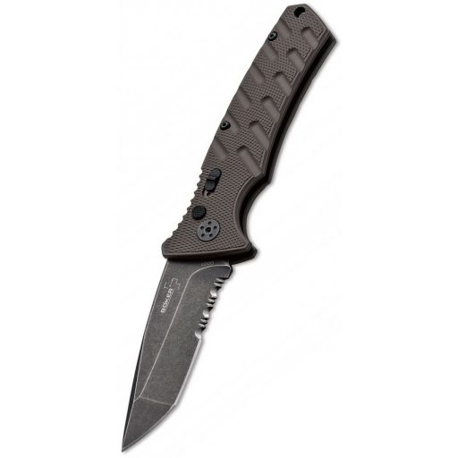 BÖKER PLUS Strike Coyote Tanto zsebkés Könnyű. aluminium markolatos. mindennapi használatra tervezett automata nyitású bicska az unalmas mindennapokra. A penge rögzíthető. igy nem kell félnünk a véletlen nyitás miatt. A felülete fekete kőmosott kivitelű és a tanto hegyet formáz mely az él kb. 2/3 részéig fogazott.