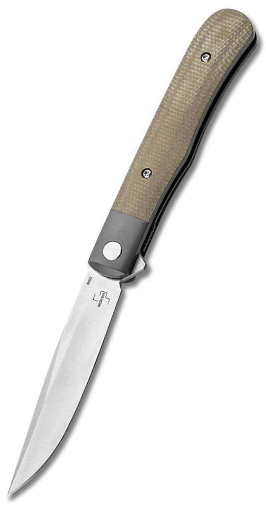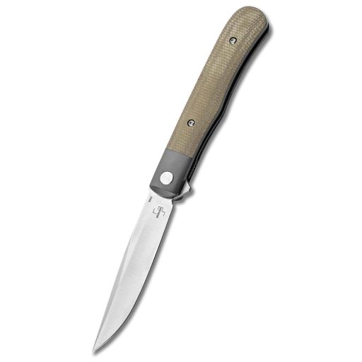 A kés technikai alapját egy 8,2 cm hosszú penge adja, amely a modern késipar egyik nagy favoritjából, a nitrogénnel és vanádiummal ötvözött Nitro-V rozsdamentes acélból készült. Ez az acéltípus kiemelkedő szívósságáról és korrózióállóságáról híres, miközben rendkívül finom élt képes tartani. A penge vastagsága mindössze 2,3 mm, ami a Brad Zinker-féle geometriával kombinálva igazi „slicer” (metsző) képességekkel ruházza fel a kést: minimális ellenállással hatol át az anyagokon. A nyitási mechanizmus a diszkrét flipper és a golyóscsapágyazott tengelyrendszer révén manuális, mégis villámgyors és sima működést tesz lehetővé. A penge felülete bevonat nélküli (unbeschichtet), ami tisztább, technikai megjelenést kölcsönöz az eszköznek, és megkönnyíti a karbantartást.