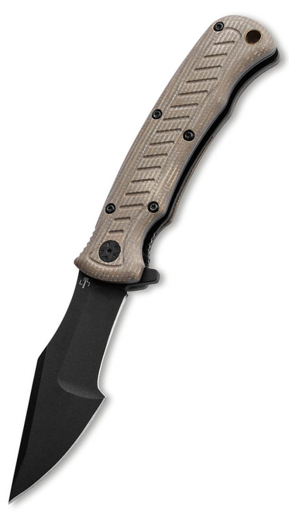A kezelhetőséget és a biztonságot a modern technikai megoldások emelik magas szintre, biztosítva a felhasználó számára a maximális kontrollt. A penge villámgyors nyitásáról a markolatból kiálló flipper (nyitókar, amelyre nyomást gyakorolva a penge kipattan) gondoskodik, amely a beépített golyóscsapágyas rendszernek köszönhetően selymesen sima mozgást biztosít. Nyitott állapotban a megbízható linerlock (keresztzár, amely egy belső acéllemezzel rögzíti a pengét) tartja fixen a szerkezetet, megakadályozva a véletlen becsukódást intenzív munka közben. A markolat anyaga barna Micarta (műgyantával nagy nyomáson préselt textil), amely nemcsak esztétikus, hanem rendkívül időjárásálló és csúszásmentes fogást biztosít még nedves vagy sáros kézzel is. Az ergonomikus kialakítás és a markolat végén található sárgaréz zsinórfurat (brass lanyard stud) a klasszikus, fix pengés tracker modellek hangulatát idézi, miközben praktikus rögzítési lehetőséget kínál. A 19 centiméteres teljes hossz kényelmes fogást biztosít bármilyen kézmérethez, miközben a 107 grammos súly és a szerkezet tökéletes egyensúlyt teremt a penge és a markolat között.