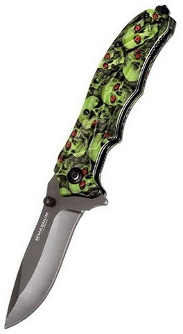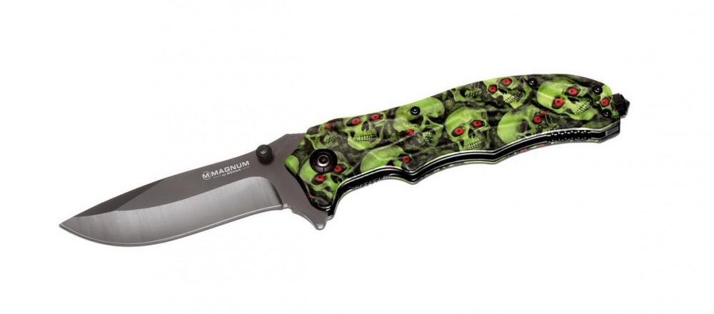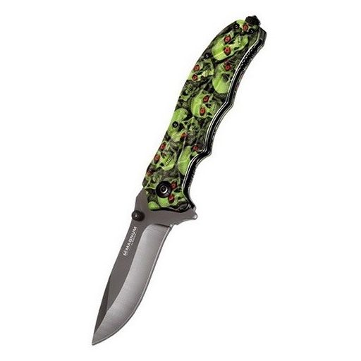 BOKER MAGNUM Hades Rescue zsebkés markolatán található zöld koponyák izzó vörös szemekkel teszik igazán izgalmassá ezt az üvegtörővel. és 440 acélpengével ellátott foldert. A penge természetesen rozsdamentes acél melyet keresztzár rögzít.