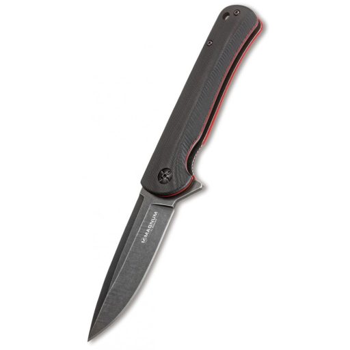 G-10 markolatpanelek felülete finom, de hatékony textúrával rendelkezik. A fekete markolatpanelek alatt és a fém keret között vörös fiber található. A kés acélja 440A fekete kőmosott kivitelt kapott.