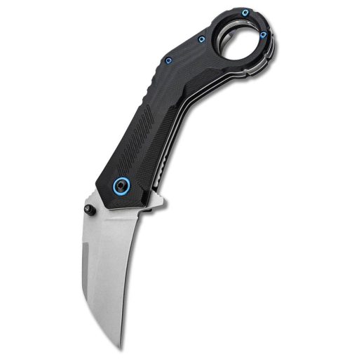 A markolat kialakítása során a maximális kontroll és a kényelem volt az elsődleges szempont. Az ívelt vázra épített texturált G10 (nagy nyomáson préselt, üvegszál-erősítésű műgyanta laminátum) markolatpanelek még nedves vagy csúszós körülmények között is biztos fogást garantálnak. A karambitokra jellemző módon a markolat végén egy ujjgyűrű található, amely eredetileg a kés kisujjal való rögzítésére szolgált, de a modern használatban zsinórfuratként (lanyard hole) is tökéletesen funkcionál. Az esztétikai megjelenést a kék eloxált (elektrokémiai úton színezett és védőréteggel bevont) elemek teszik teljessé: a penge tengelycsavarja körüli gyűrű és a markolatot tartó csavarok vibráló kontrasztot alkotnak a sötét panelekkel. Ez a modern akcentus egyedivé teszi a délkelet-ázsiai eredetű formavilágot, miközben az ergonomikus hajlítás biztosítja, hogy a kés természetesen feküdjön a kézben.