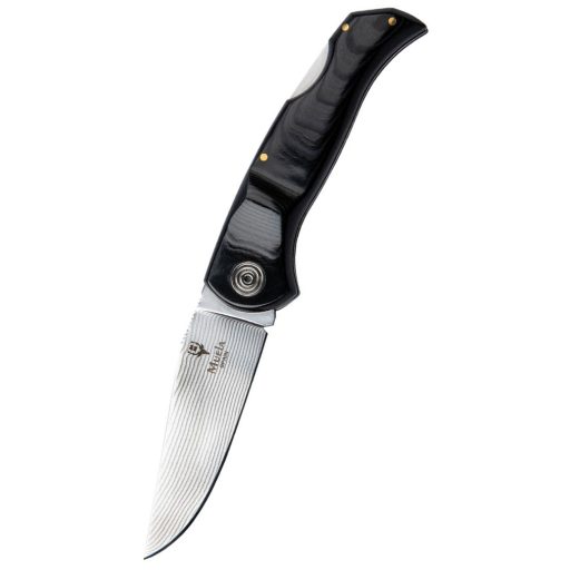A kés pengéje rozsdamentes damaszkuszi acél, amely nemcsak esztétikus, hanem ellenálló is a korrózióval szemben. A penge drop point kialakítású, finoman ívelt éllel és tompított gerinccel, amely jó kontrollt és biztonságos használatot nyújt. A penge backlock zármechanizmussal rögzül, amely tartós és stabil szerkezetet biztosít, különösen gyűjtői vagy alkalmi használatra. A markolat 3D textúrázott fekete Micarta, amely jól tapadó, enyhén strukturált felületet ad, miközben megtartja a tradicionális megjelenést. A konstrukció illesztései pontosak, az anyagválasztás tartós, de esztétikailag is igényes. A késhez tartozik egy fekete bőr tok, valamint egy díszdoboz, amely esztétikus csomagolást biztosít, akár ajándékozási céllal is.